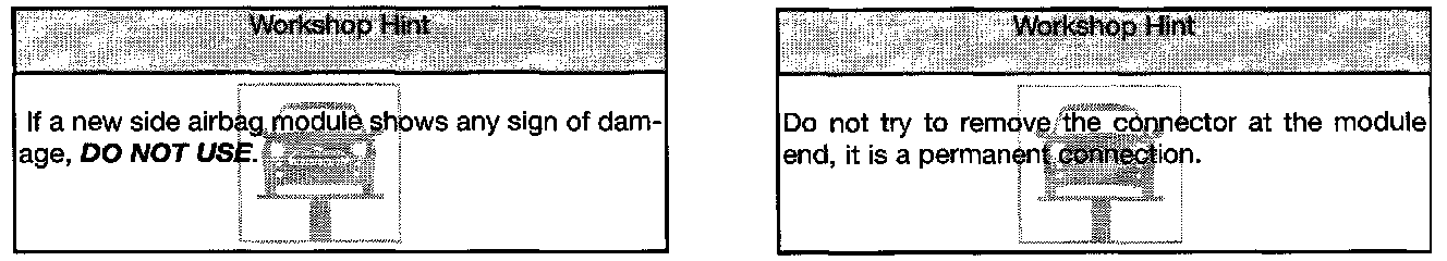 The driver and passenger side (thorax) airbags are mounted to the front seat backrest frame and are designed to protect the ribs and upper internal organs during side impacts. The modules are side specific (i.e. a right hand module must be fitted to a right hand seat and a left hand module must be fitted to a left hand seat). The side airbags are activated by a control signal from the MRS control unit in the event of a side impact or a front angled impact of sufficient severity to cause both front and side airbag deployment.