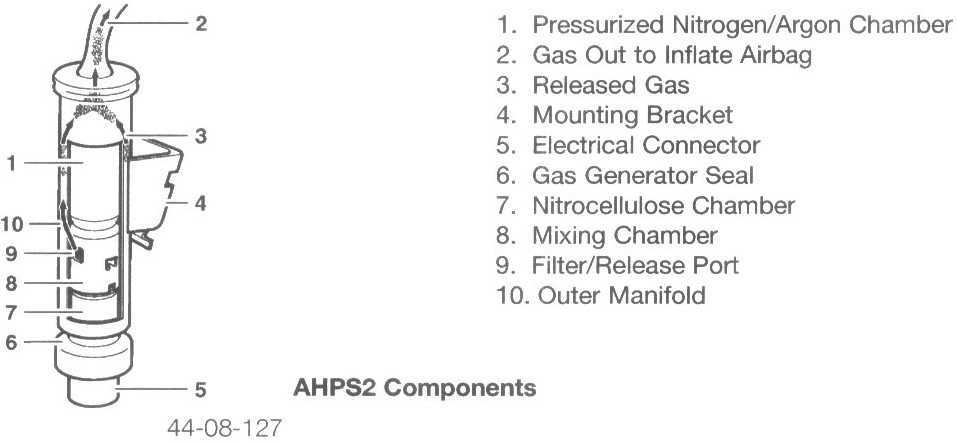 The unit contains a gas generator and igniter module, which incorporates the nitrocellulose igniter charge and pressurized gas chambers surrounded by a filter screen. The filter prevents solid combustion by-products from entering the airbag during deployment. A link lead connects the airbag module to the main vehicle harness. The other end of the link lead terminates in a squib connector on the left hand side and a squib connector on the right hand side of the passenger airbag module.