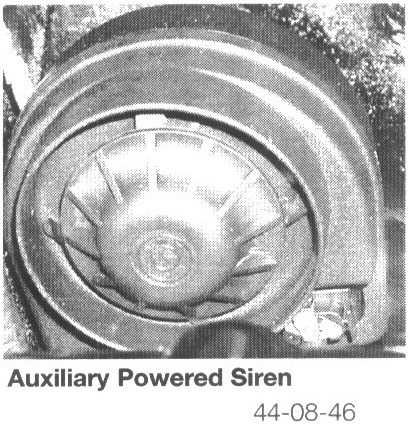The auxiliary powered siren is situated in the left hand rear of the engine bay (viewed from the front bumper). The siren contains electronic circuitry for producing the warning tone when the alarm is triggered. The siren also contains a rechargeable battery that is used to power the siren when the alarm is triggered.