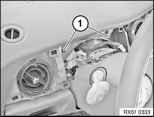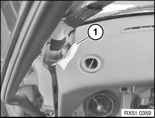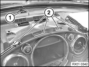 Remove instrument panel upper section towards top and feed out restraint cables (2) between airbag module and instrument panel lower section.