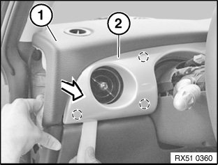 Carefully unclip decorative trim (2) and twist out of instrument panel trim.