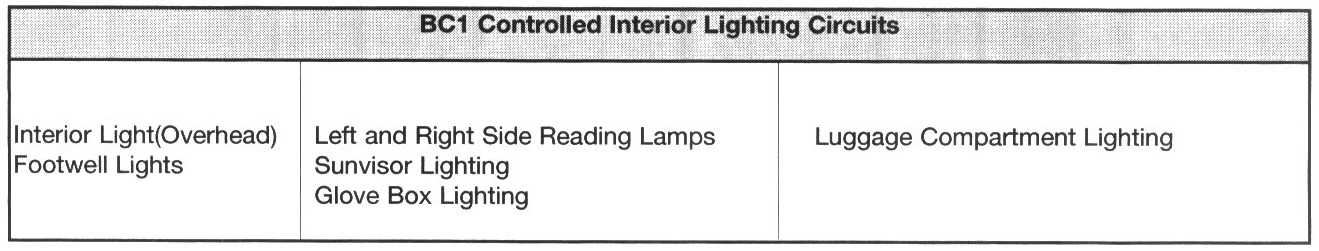 The BC1 based on its inputs controls the output of the interior lighting through pulse width modulated voltage. All decisions regarding interior light availability are made in the processing of the BC1. The BC1 controls interior light on time and shut-off to conserve battery power.