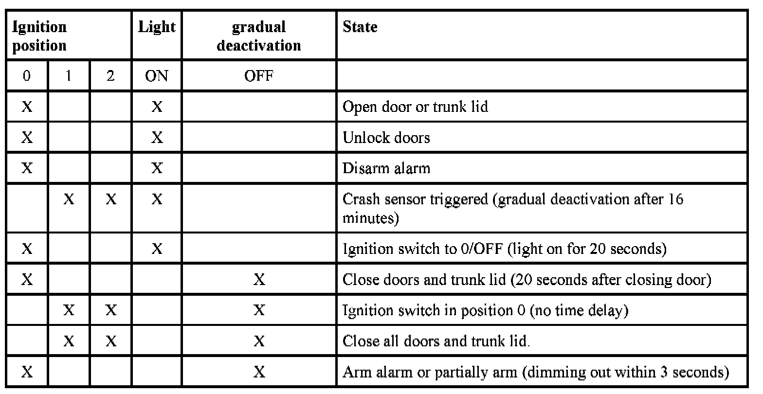 A table of the states and ignition key positions for the gradual activation and deactivation of the lights appears below: