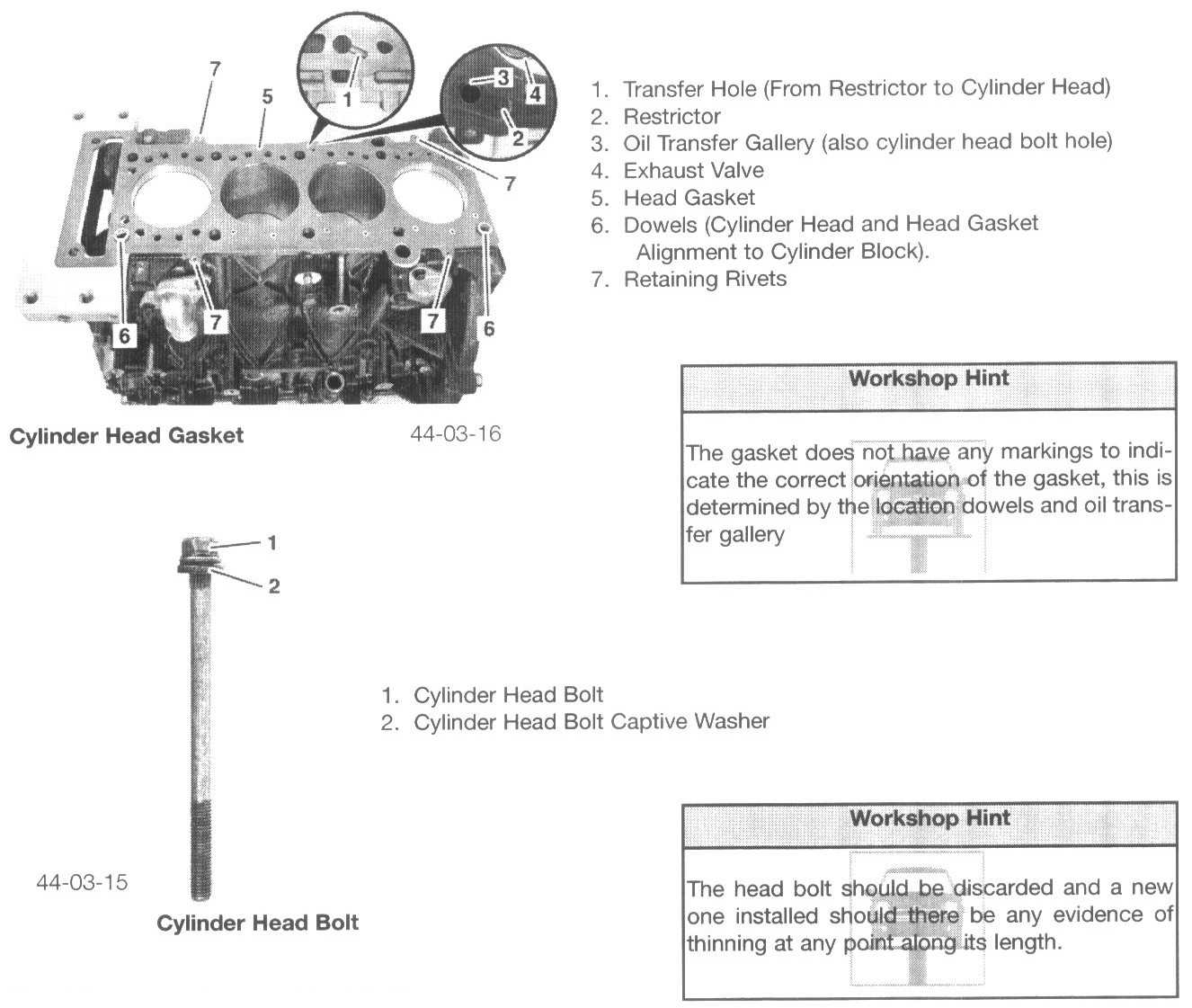 the head gasket is constructed from three layers of sheet metal and is termed as a "multi layered steel gasket". Four small rivets on the outer edge of the gasket hold the three layers together. the head gasket contains an oil restrictor that controls the oil flow to the cylinder head.