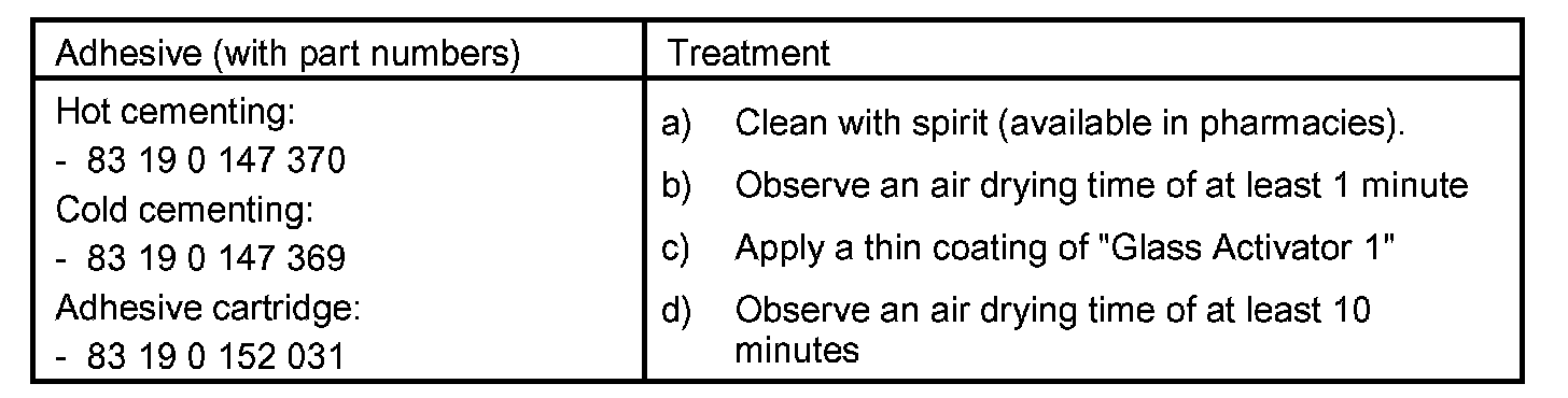 The windscreen and rear window (also the rear side windows if necessary) are bonded to the body. This gluing will increase the torsional strength of the vehicle. To obtain perfect bonding, comply with the installation procedure described in the following.