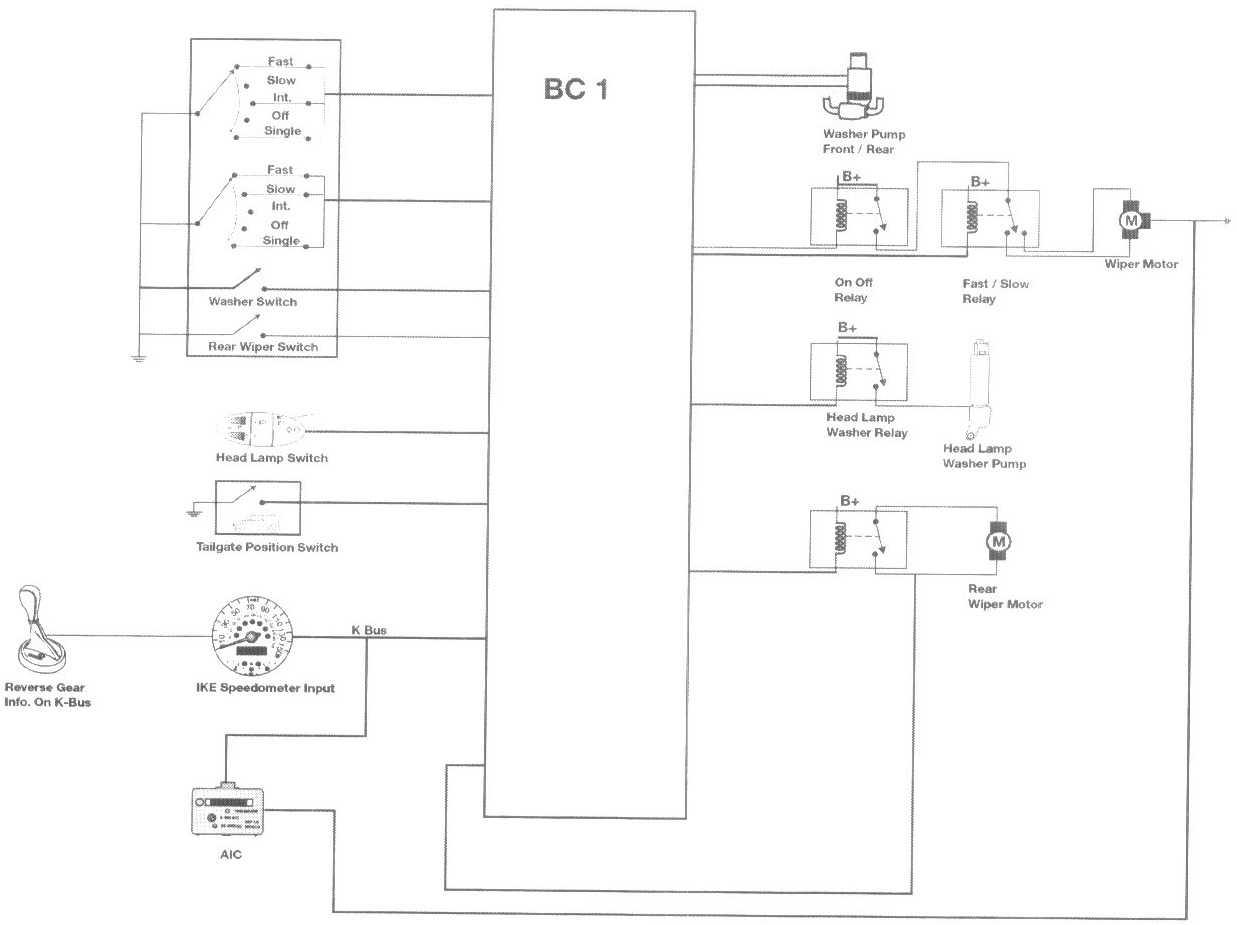 The BC1 receives input from the wiper switch and activates the wiper relays based on other input criteria (eg. Speed signal over K-Bus, AIC input, Headlamp switch status, Tailgate position).