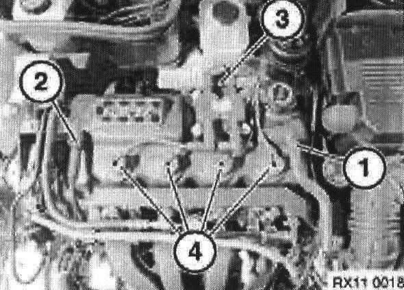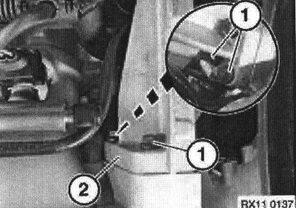 Remove bolts (1) securing left hand bracket and remove bracket (2).