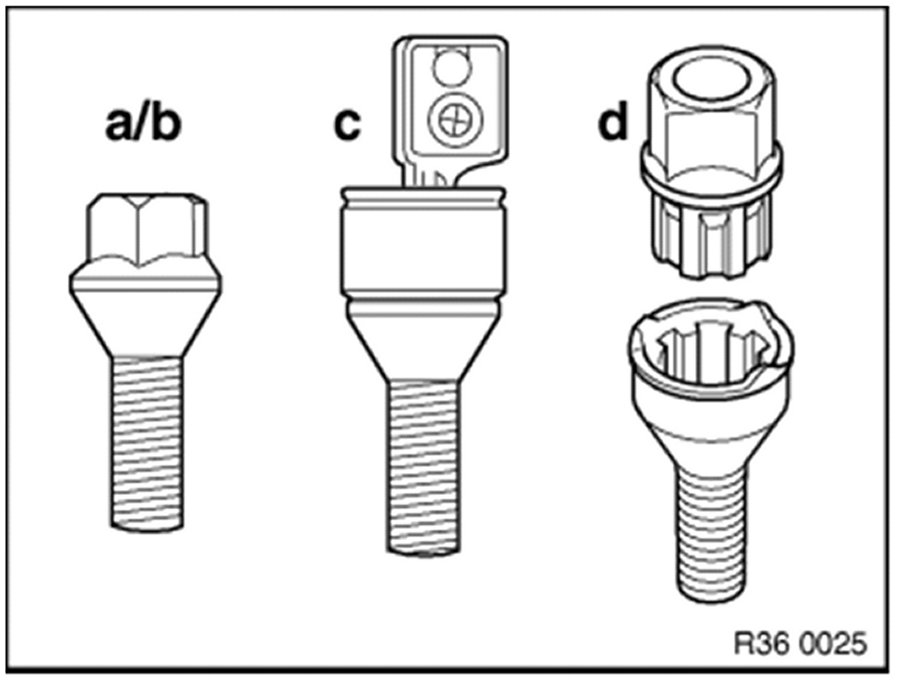 Use matching adapter from special tool kit 36 1 300 (wheel bolt adapter set) to release and tighten down lockable wheel bolt.