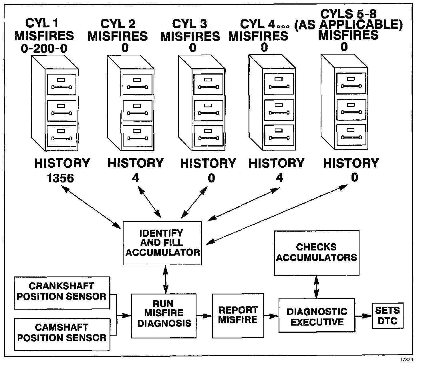 Whenever a cylinder misfires the misfire diagnostic counts the misfire and notes the crankshaft position at the time the misfire occurred.