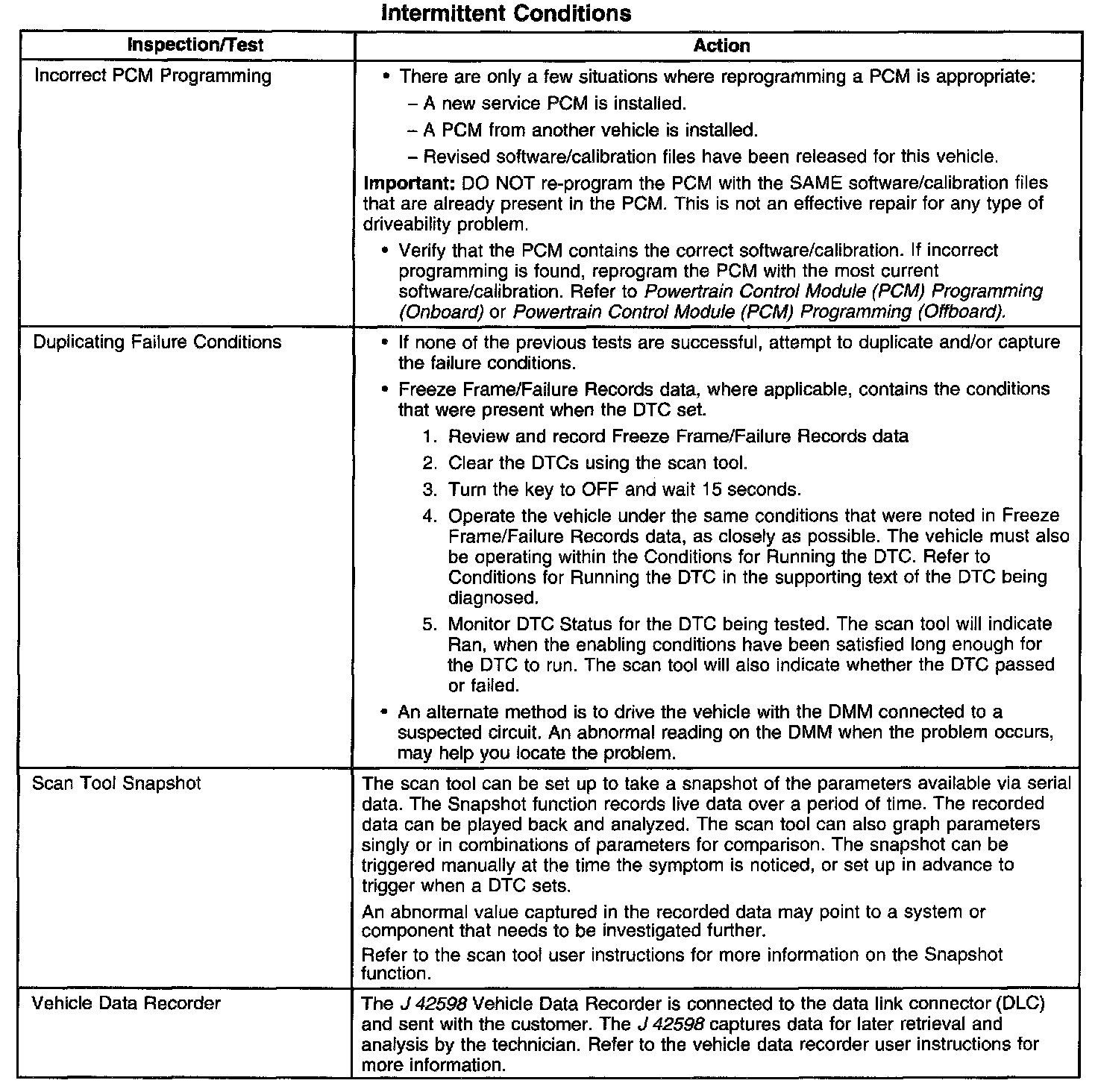 ^ Using a scan tool Freeze Frame/Failure Records can also aid in locating an intermittent condition. Review and capture the information in the Freeze Frame/Failure Record associated with the intermittent DTC being diagnosed. Drive the vehicle in the conditions that were present when the DTC originally set.