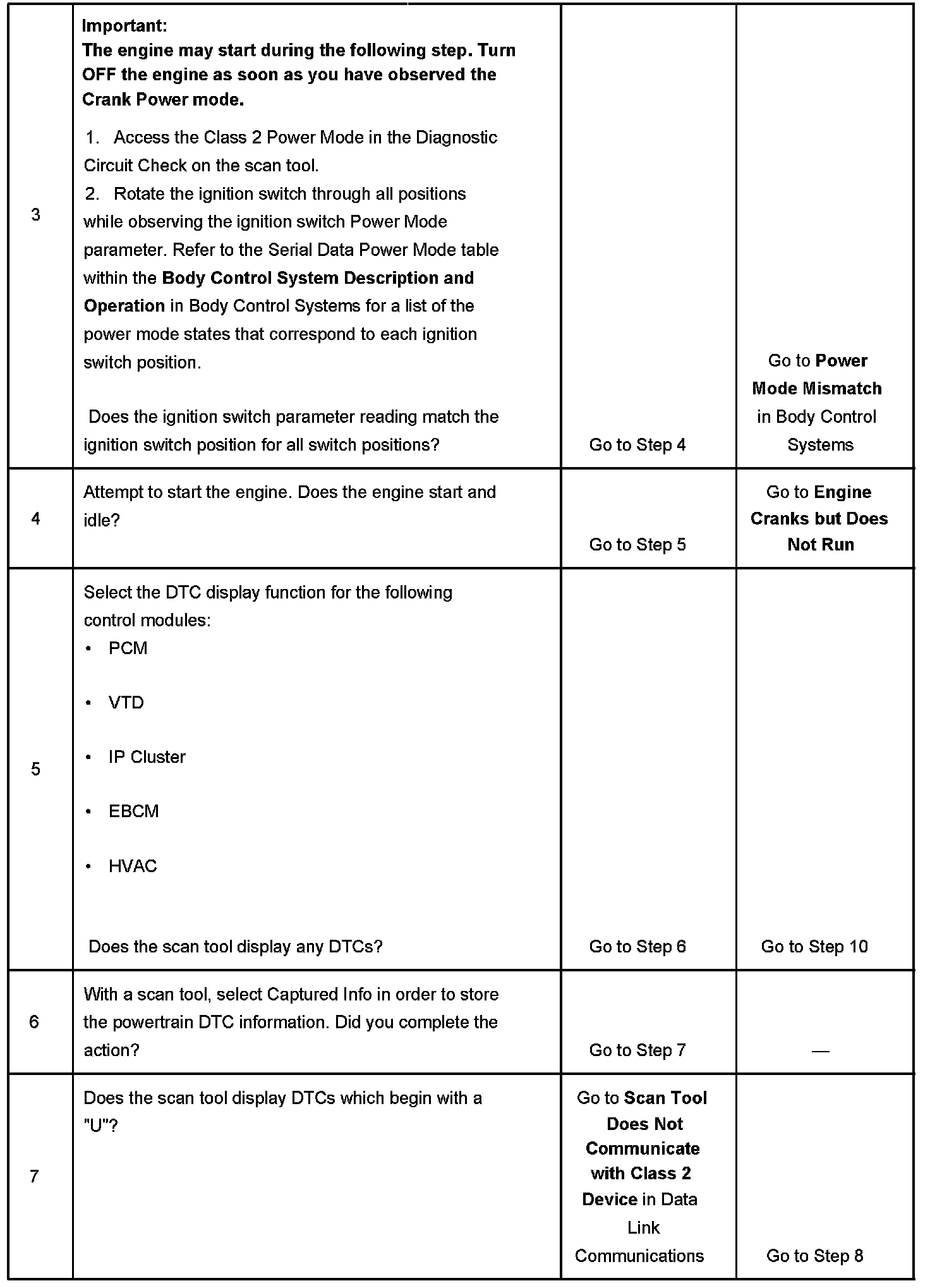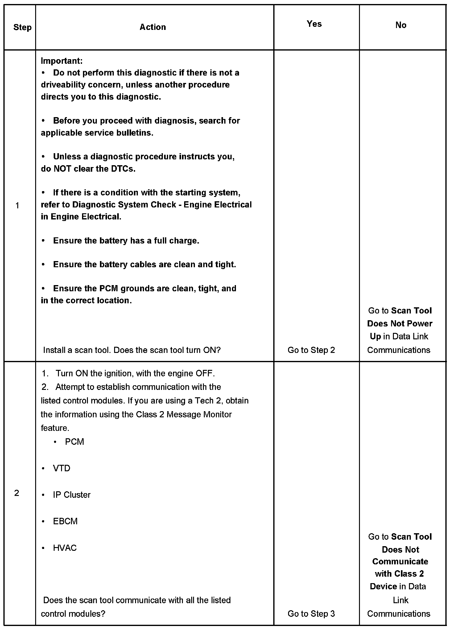 2. Lack of communication may be because of a partial or a total malfunction of the Class 2 serial data circuit. The specified procedure determines the particular condition.