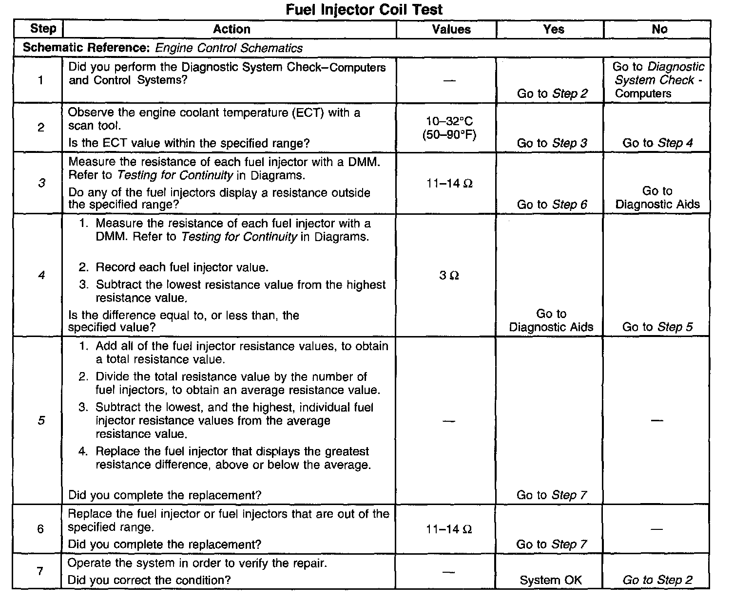 ^ Perform the fuel injector coil test within the conditions of the customers concern. A fuel injector condition may only be apparent at a certain temperature, or under certain conditions.