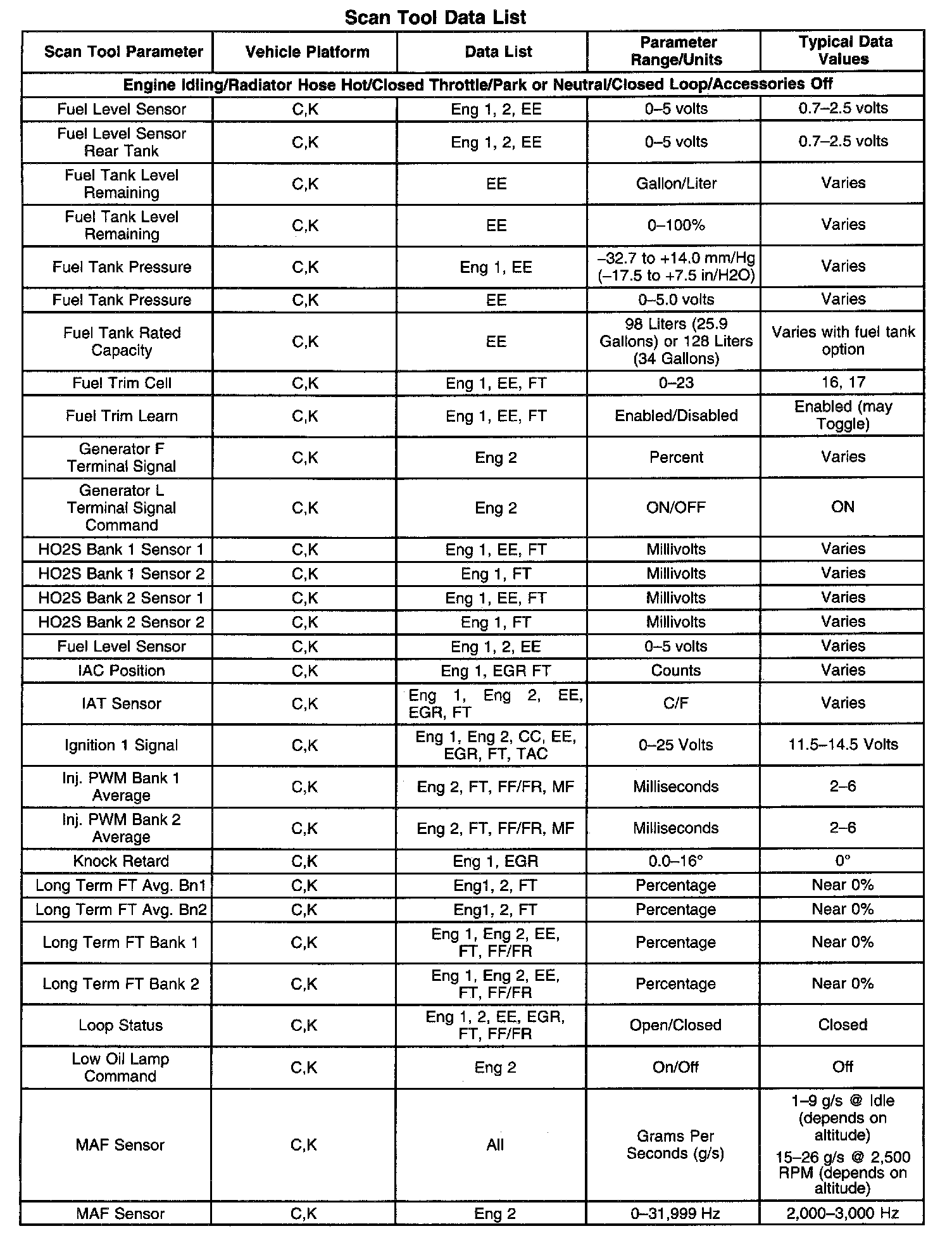 The Engine Scan Tool Data List contains all engine related parameters that are available on the scan tool. The list is arranged in alphabetical order. A given parameter may appear in any one of the data lists, and in some cases may appear more than once, or in more than one data list in order to group certain related parameters together.