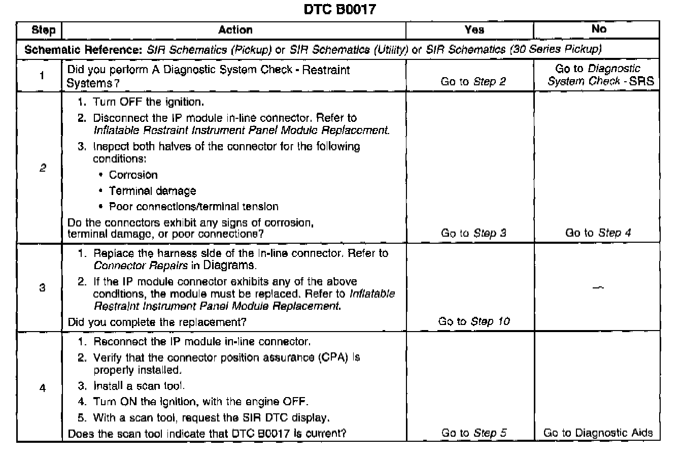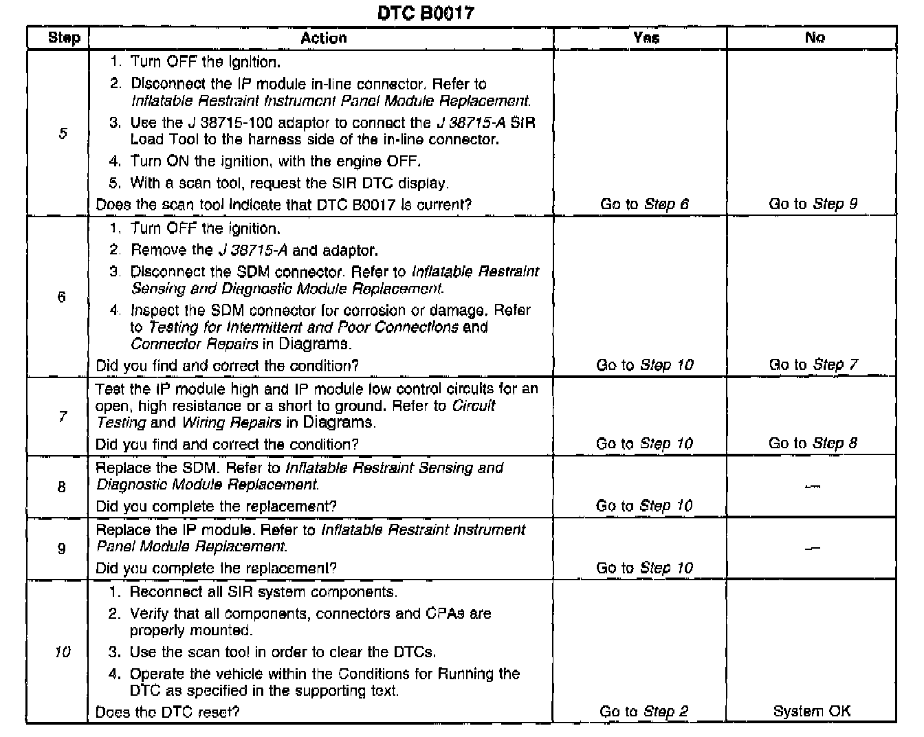 The inflatable restraint IP module deployment loop consists of an IP module, IP module high control circuit, and IP module low control circuit. A shorting bar is used on the P module connector which will short together the IP module high and IP module low control circuits when the connector is disconnected. This will help to prevent unwanted deployment of the inflator module during servicing. When the ignition is turned ON, the inflatable restraint sensing and diagnostic module (SDM) performs continuous diagnostic tests on the deployment loops to check for proper circuit continuity and for shorts to ground or voltage. If a malfunction is detected, a DTC will be stored.