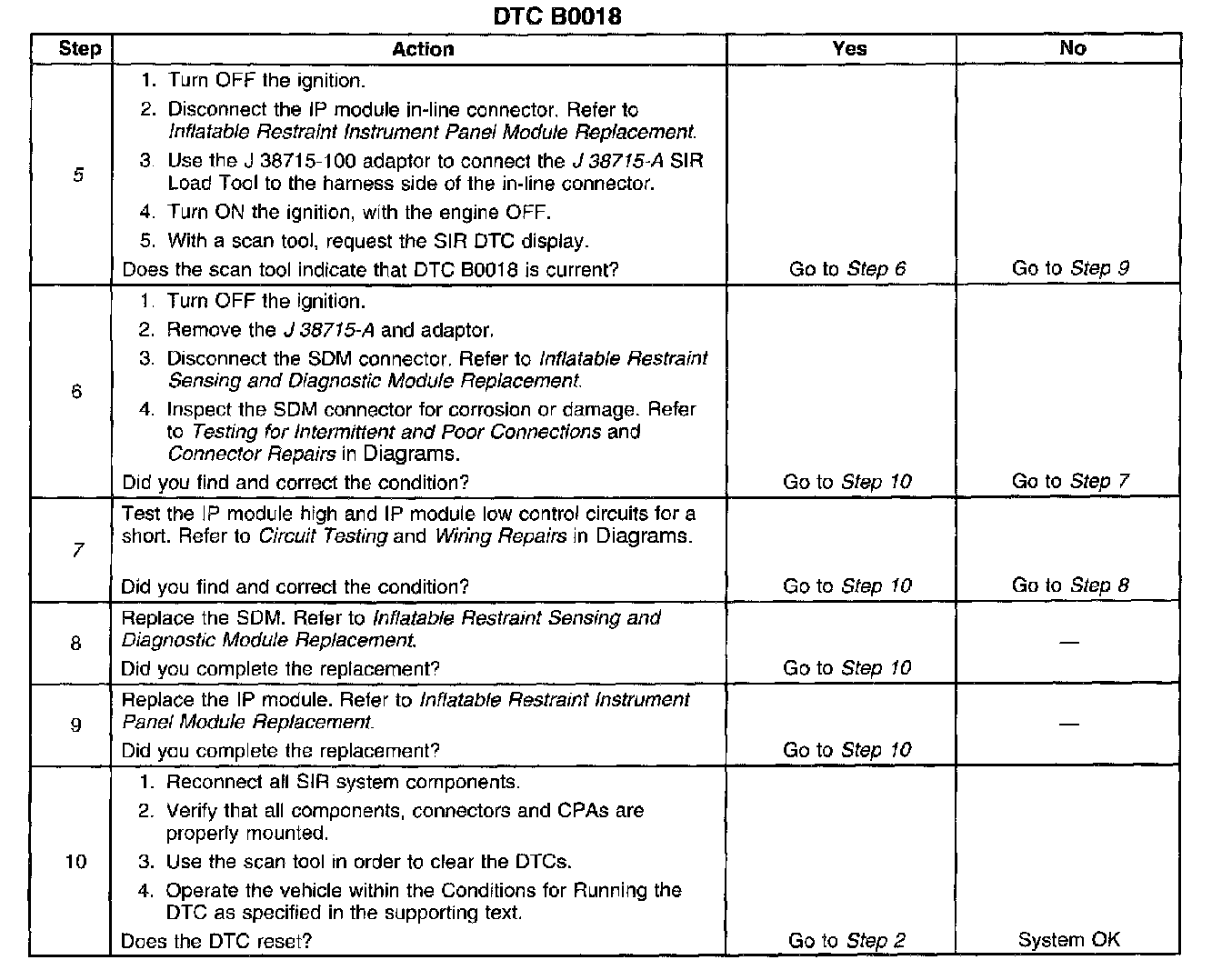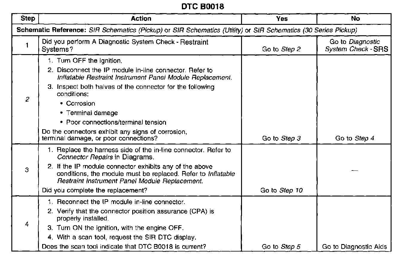 The inflatable restraint IP module deployment loop consists of an IP module, IP module high control circuit, and IP module low control circuit. A shorting bar is used on the P module connector which will short together the IP module high and IP module low control circuits when the connector is disconnected. This will help to prevent unwanted deployment of the inflator module during servicing. When the ignition is turned ON, the inflatable restraint sensing and diagnostic module (SDM) performs continuous diagnostic tests on the deployment loops to check for proper circuit continuity and for shorts to ground or voltage. It a malfunction is detected, a DTC will be stored.