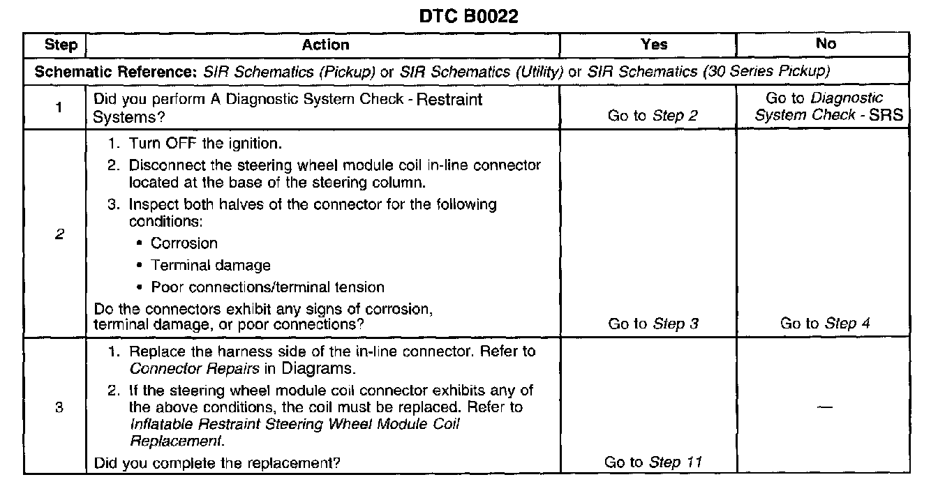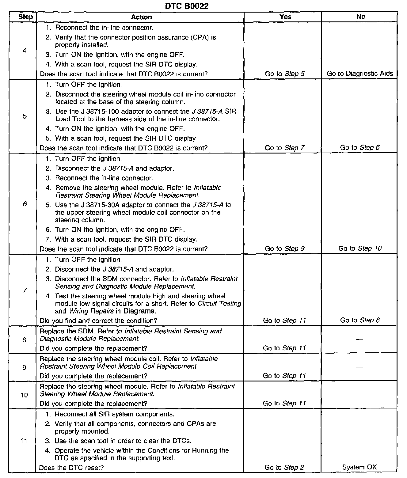 The inflatable restraint steering wheel module deployment loop consists of a steering wheel module, steering wheel module coil, steering wheel module high signal circuit and steering wheel module low signal circuit. Shorting bars are used on the steering wheel module connector as well as the steering wheel module coil connector which will short together the steering wheel module high and steering wheel module low signal circuits when the connector is disconnected. This will help to prevent unwanted deployment of the inflator module during servicing. When the ignition is turned ON, the inflatable restraint sensing and diagnostic module (SDM) performs continuous diagnostic tests on the deployment loops to check for proper circuit continuity and for shorts to ground or voltage. If a malfunction is detected, a DTC will be stored.