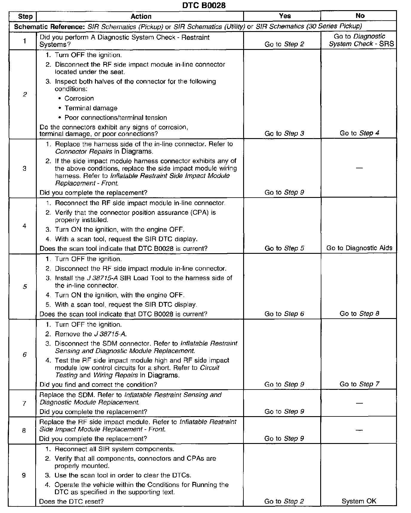 The inflatable restraint side impact module deployment loop consists of a side impact module, side impact module high control circuit, and side impact module low control circuit. A shorting bar is used on the side impact module connector which will short together the side impact module high and side impact module low control circuits when the connector is disconnected. This will help to prevent unwanted deployment of the inflator module during servicing. When the ignition is turned ON, the inflatable restraint sensing and diagnostic module (SDM) performs continuous diagnostic tests on the deployment loops to check for proper circuit continuity and for shorts to ground or voltage. If a malfunction is detected a DTC will be stored.
