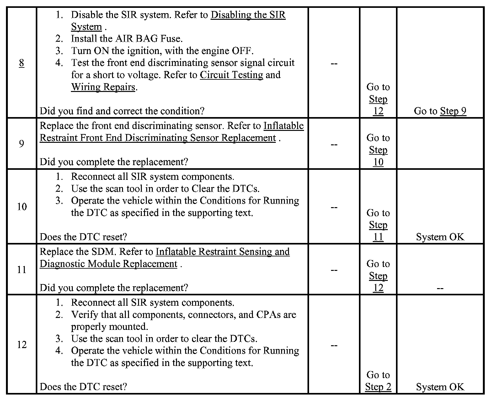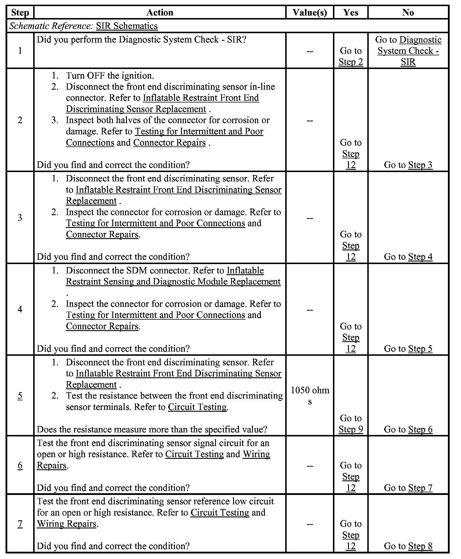 The inflatable restraint sensing and diagnostic module (SDM) monitors the inflatable restraint front end discriminating sensor circuit for front impact detection. The SDM processes the signal provided by the front end discriminating sensor to further support deployment of the air bags. The front end discriminating sensor is an input only to the SDM and does not directly cause air bag deployment. When the ignition is turned ON, the SDM performs continuous diagnostic tests on the deployment loops to check for proper circuit continuity and for shorts to ground or voltage. If a malfunction is detected, a DTC will be stored.