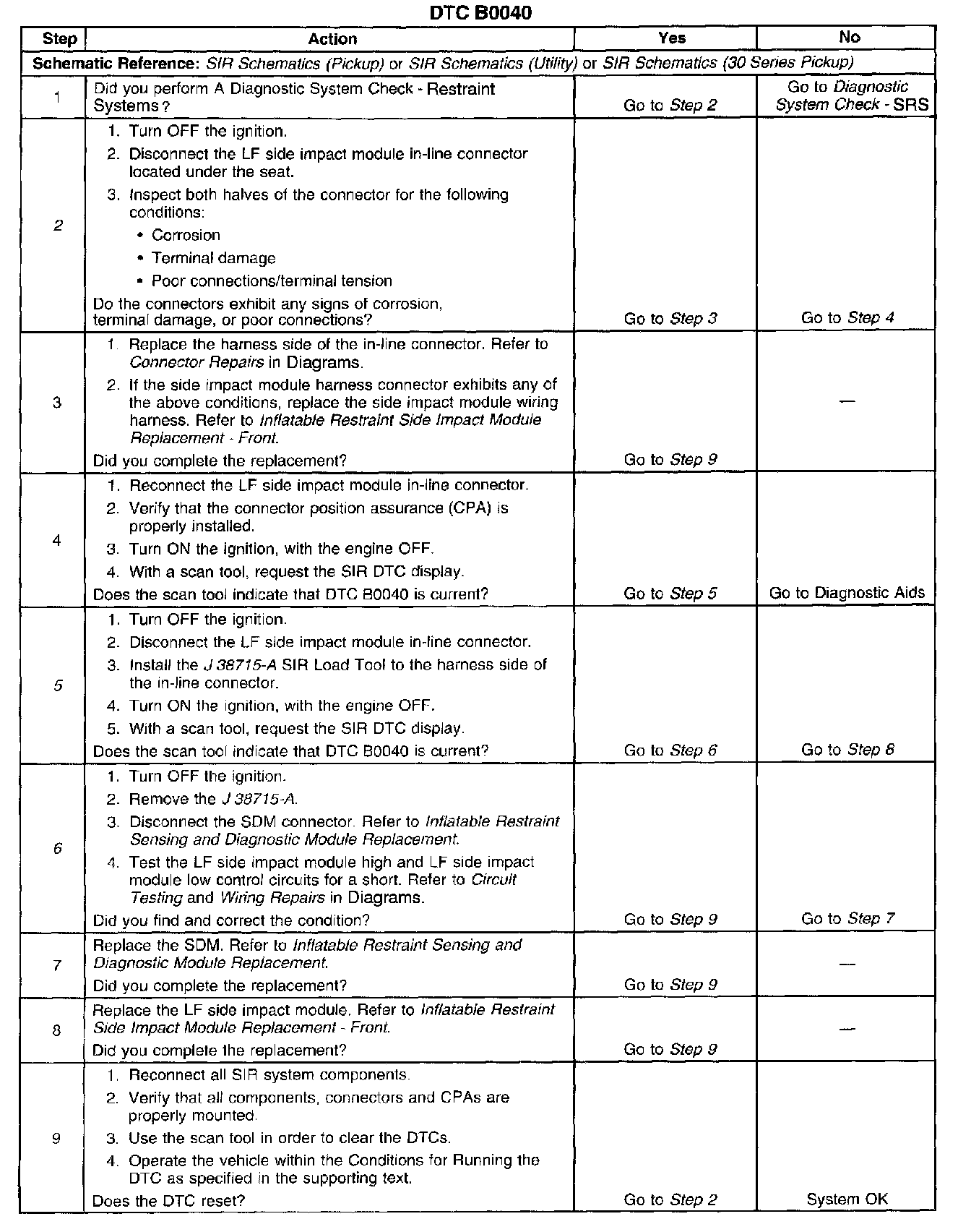 The inflatable restraint side impact module deployment loop consists of a side impact module, side impact module high control circuit, and side impact module low control circuit. A shorting bar is used on the side impact module connector which will short together the side impact module high and side impact module low control circuits when the connector is disconnected. This will help to prevent unwanted deployment of the inflator module during servicing. When the ignition is turned ON, the inflatable restraint sensing and diagnostic module (SDM) performs continuous diagnostic tests on the deployment loops to check for proper circuit continuity and for shorts to ground or voltage. If a malfunction is detected, a DTC will be stored.