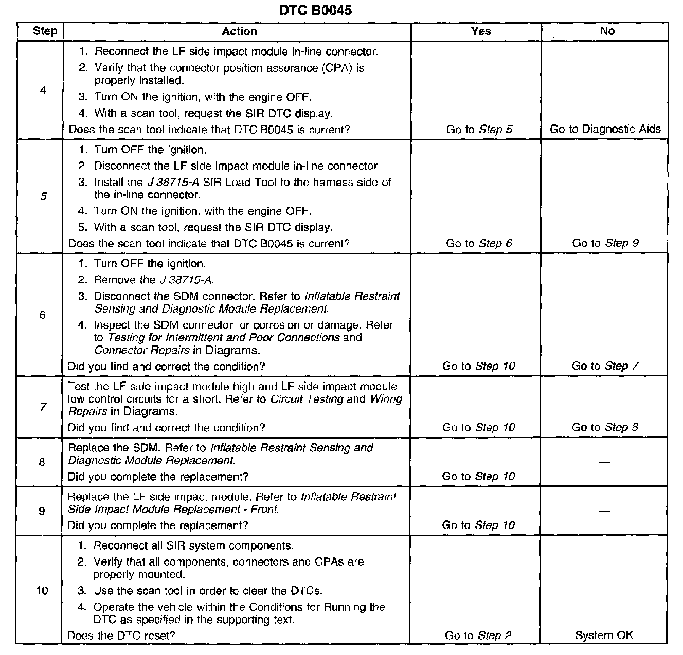 The inflatable restraint side impact module deployment loop consists of a side impact module, side impact module high control circuit, and side impact module low control Circuit. A shorting bar is used on the side impact module connector which will short together the side impact module high and side impact module low control circuits when the connector is disconnected. This will help to prevent unwanted deployment of the inflator module during servicing. When the ignition is turned ON, the inflatable restraint sensing and diagnostic module (SDM) performs continuous diagnostic tests on the deployment loops to check for proper circuit continuity and for shorts to ground or voltage. If a malfunction is detected, a DTC will be stored.