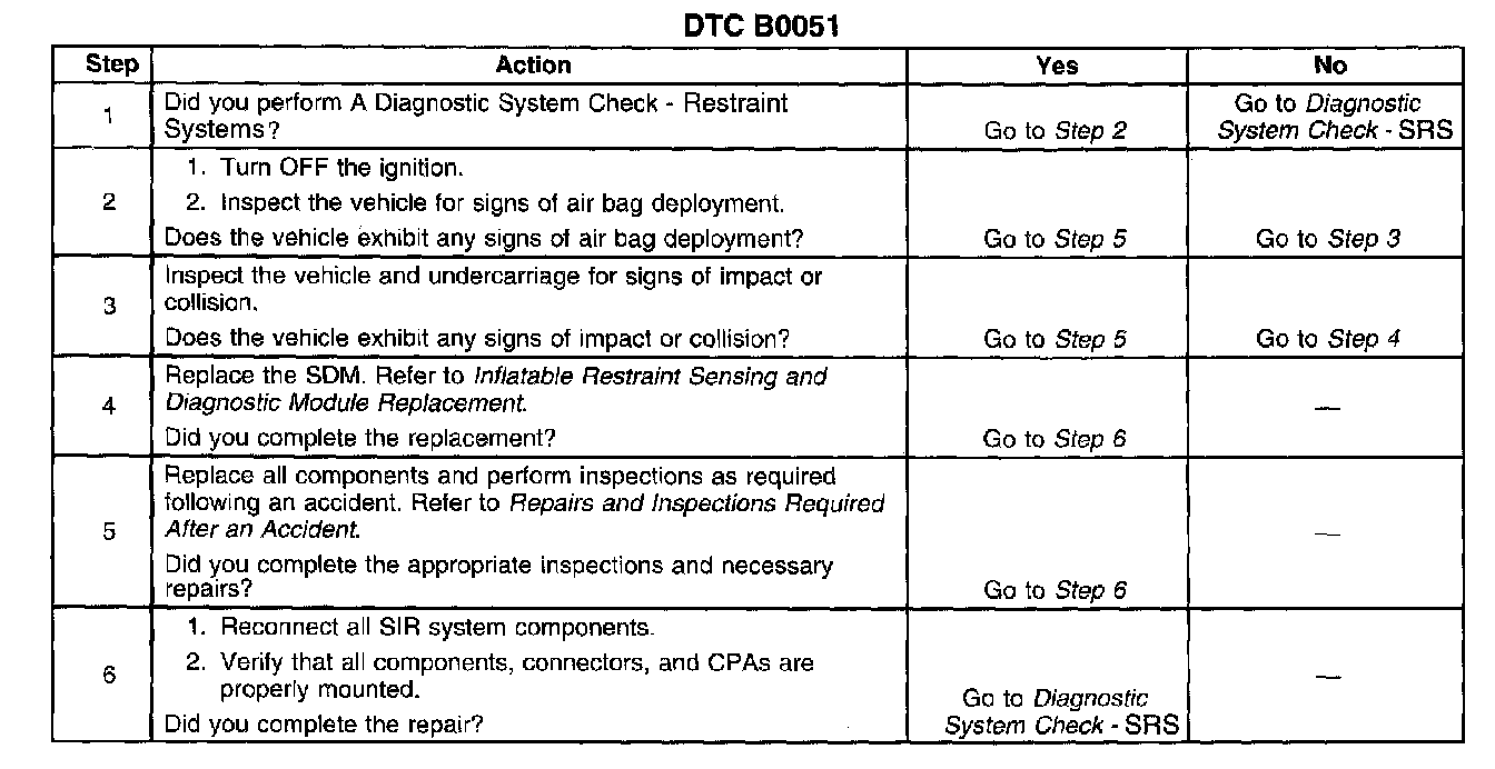 CIRCUIT DESCRIPTIONThe inflatable restraint sensing and diagnostic module (SDM) contains a sensing device (accelerometer) that converts vehicle velocity to an electrical signal. The SDM compares this signal to a value stored in memory. When the generated signal exceeds the stored value, the SDM performs additional signal processing and compares the generated signals to values stored in memory. When two of the generated signals exceed the stored values, the SDM will cause current to flow through the inflator modules, deploying the air bags and causing DTC B0051 to set.