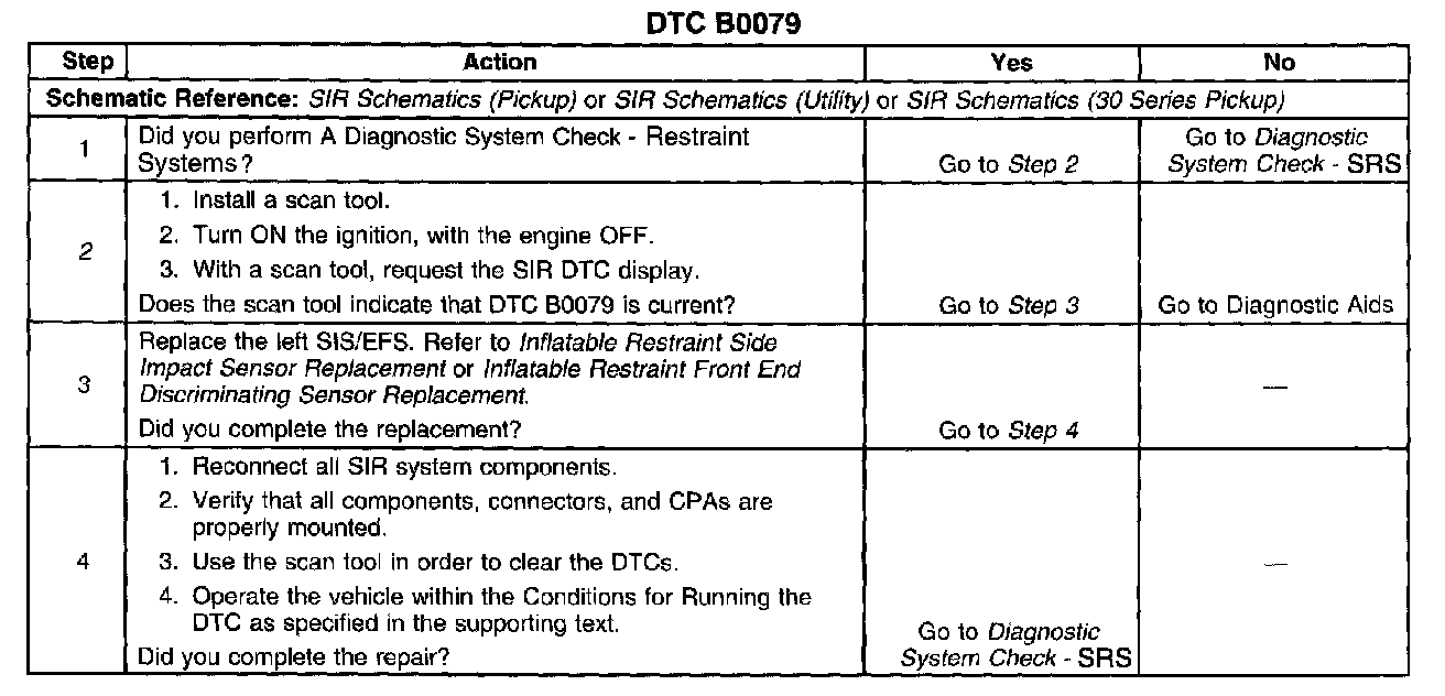 IMPORTANT: This DTC is also used for the inflatable restraint electronic frontal sensor (EFS) found on the 35/36 series trucks. The 35/36 series trucks have one EFS located at the front of the vehicle. The EFS is diagnosed the same way as the inflatable restraint side impact sensor (SIS) used on Utility models. The following diagnostics will refer to the left SIS or the EFS depending on what series truck you are diagnosing.