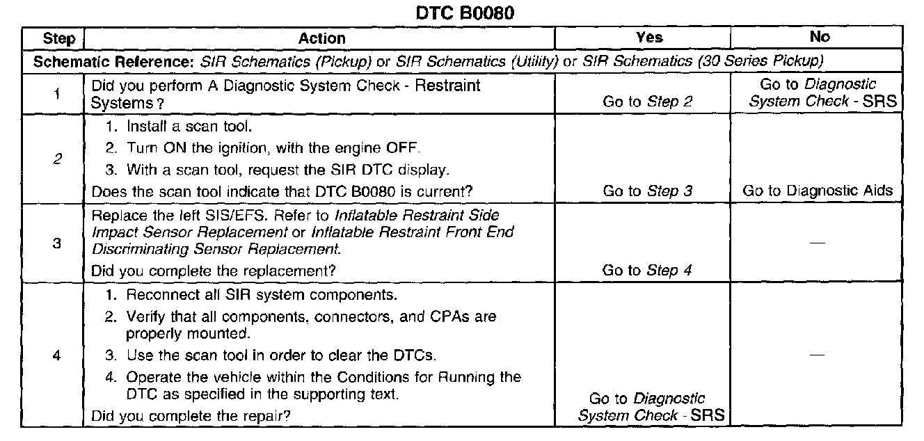 IMPORTANT: This DTC is also used for the inflatable restraint electronic frontal sensor (EFS) found on the 35/36 series trucks. The 35/36 series trucks have one EFS located at the front of the vehicle. The EFS is diagnosed the same way as the inflatable restraint side impact sensor (SIS) used on Utility models. The following diagnostics will refer to the left SIS or the EFS depending on what series truck you are diagnosing.