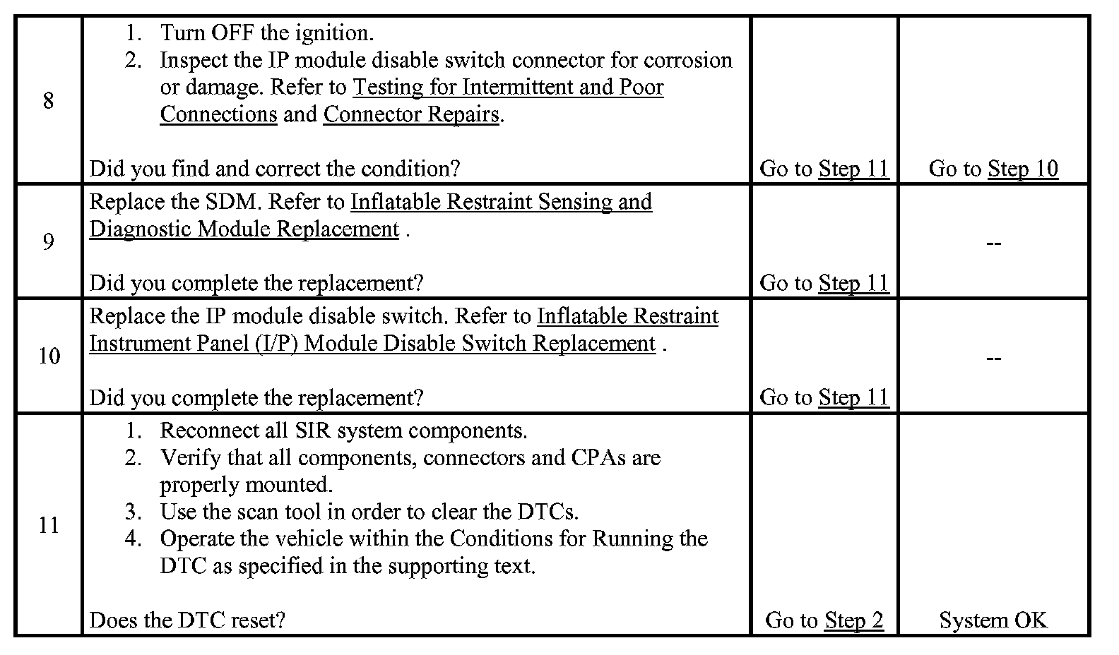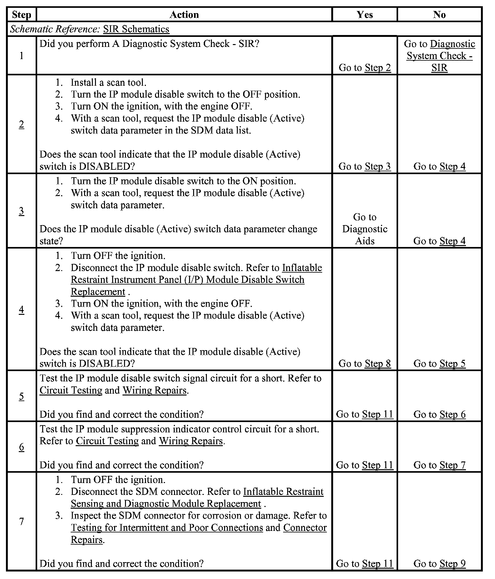 The inflatable restraint IP module disable switch circuit consists of an IP module disable switch, IP module disable switch indicator, IP module disable switch signal circuit, and IP module suppression indicator control circuit. When the ignition is turned ON, the inflatable restraint sensing and diagnostic module (SDM) performs tests to diagnose critical malfunctions within itself. The SDM monitors the voltage levels at the IP module disable switch signal and the IP module suppression indicator control circuits of the SDM to determine the position of the IP module disable switch. If a malfunction is detected, a DTC will be stored.