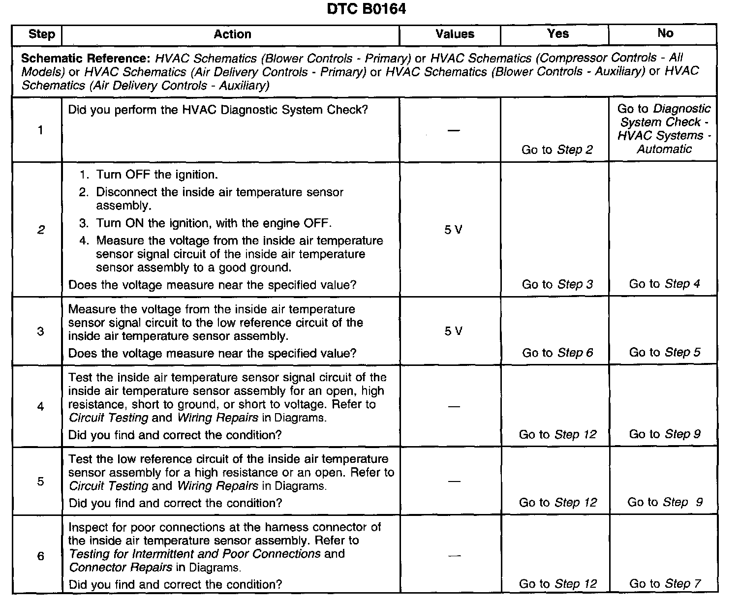 CIRCUIT DESCRIPTIONThe HVAC control module monitors the passenger compartment inside air temperature via an inside air temperature sensor assembly. When the air is cold, the sensor resistance and signal voltage are high. When the air is warm, the sensor resistance and signal voltage are low.