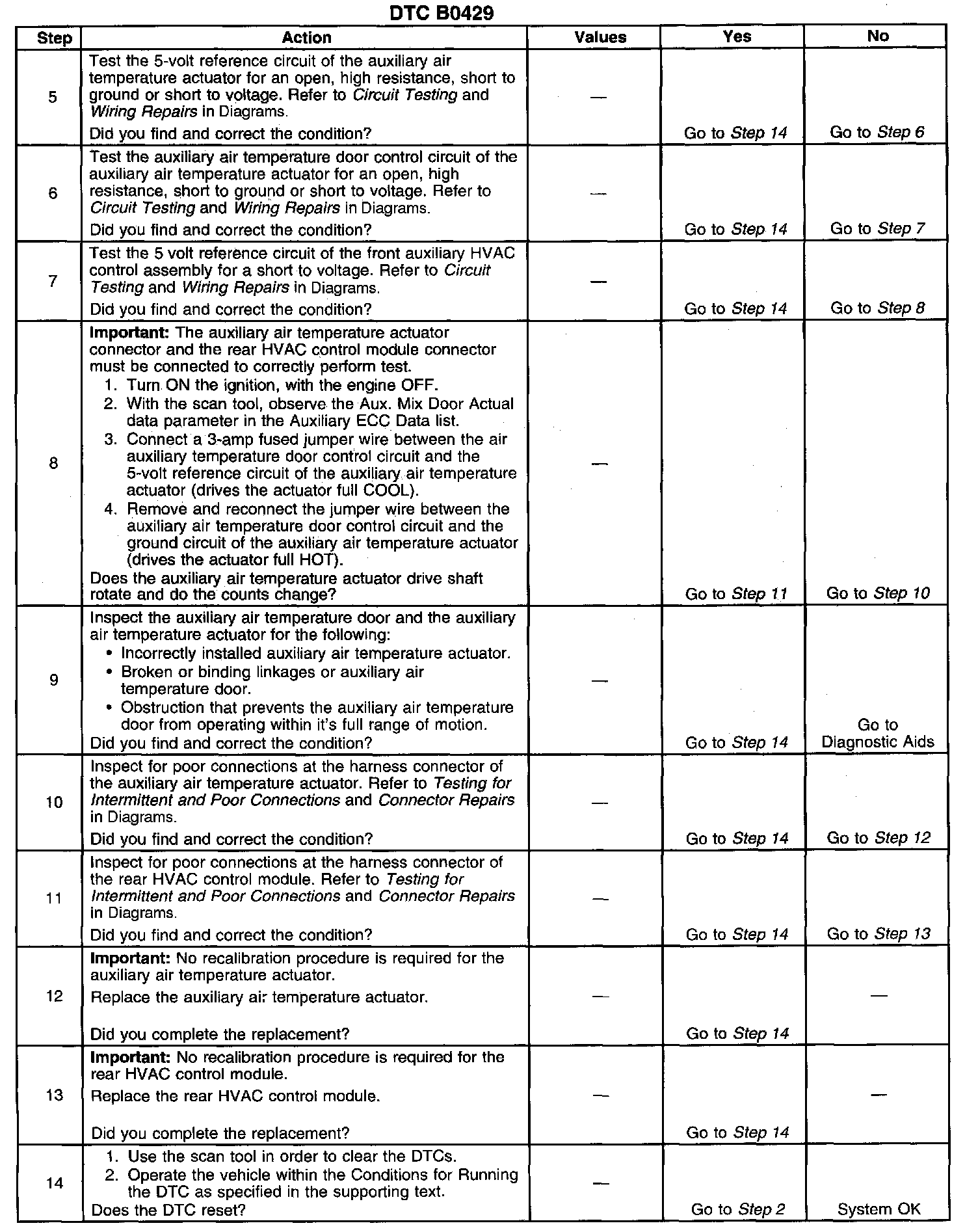 CIRCUIT DESCRIPTIONThe auxiliary air temperature actuator is an electronic device that incorporates a stepper motor and feedback potentiometer. The position of the auxiliary air temperature actuator is based on the auxiliary air temperature door position signal voltage from the potentiometer. The rear auxiliary HVAC module converts this voltage to a digital signal that can be transmitted over the Keyboard Display Driver (KDD) data bus to the HVAC control module. The HVAC control module contains the logic that controls the operation of the auxiliary air temperature actuator. When a change in air temperature is required (greater than 4 counts) the HVAC control module will drive the air temperature actuator in the appropriate direction to achieve the desired setting while comparing the actual position to the commanded position. If the actual value differs from the commanded value by 4 or more counts, the actuator is considered stalled and the DTC will set.