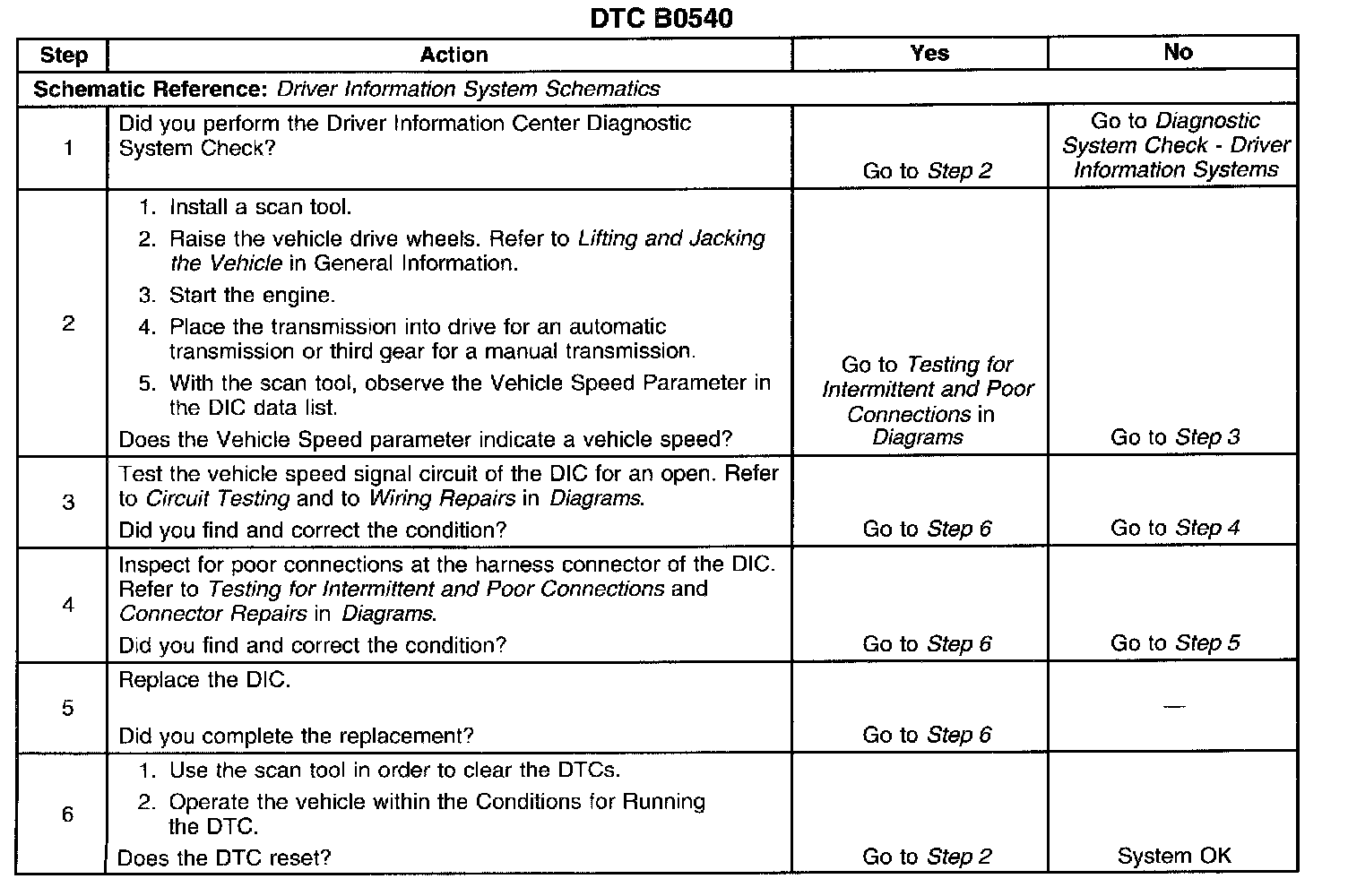 CIRCUIT DESCRIPTIONThe DIC receives the vehicle speed information from the PCM. The PCM converts the data from the vehicle speed sensor to a 4000 pulses/mile signal. The PCM also sends a class 2 message to the DIC indicating the vehicle speed. If the DIC determines there is a loss of the vehicle speed signal from the PCM due to a vehicle speed signal circuit malfunction, a DTC sets.