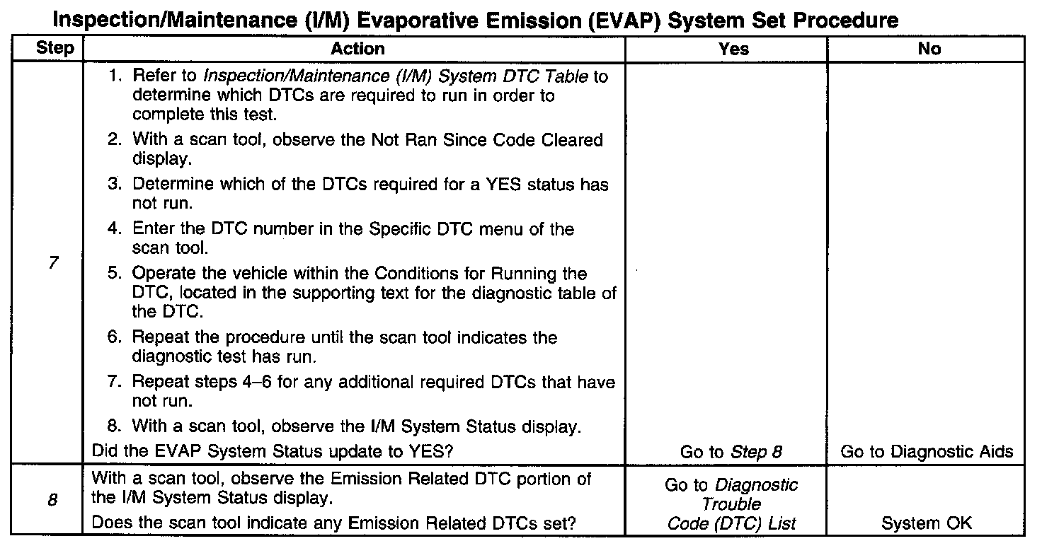 8. The I/M System Status only reports on whether or not a diagnostic has run, not the outcome of the test. If any emission-related DTC sets after the tests are complete, the DTC will require diagnosis.