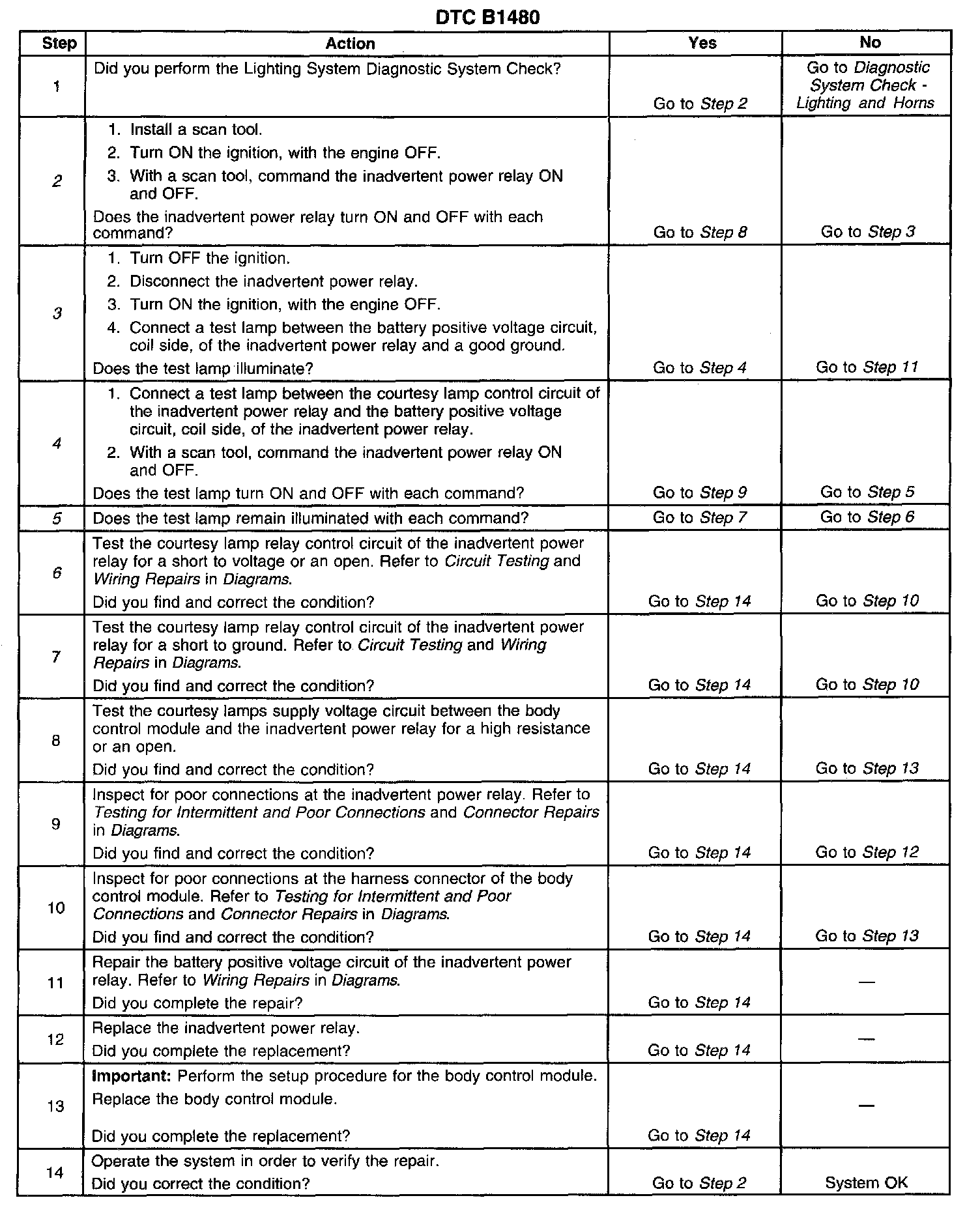 - When the BCM commands the inadvertent power relay on, and receives no voltage on the courtesy lamps supply voltage circuit at the BCM, DTC B1480 will set.