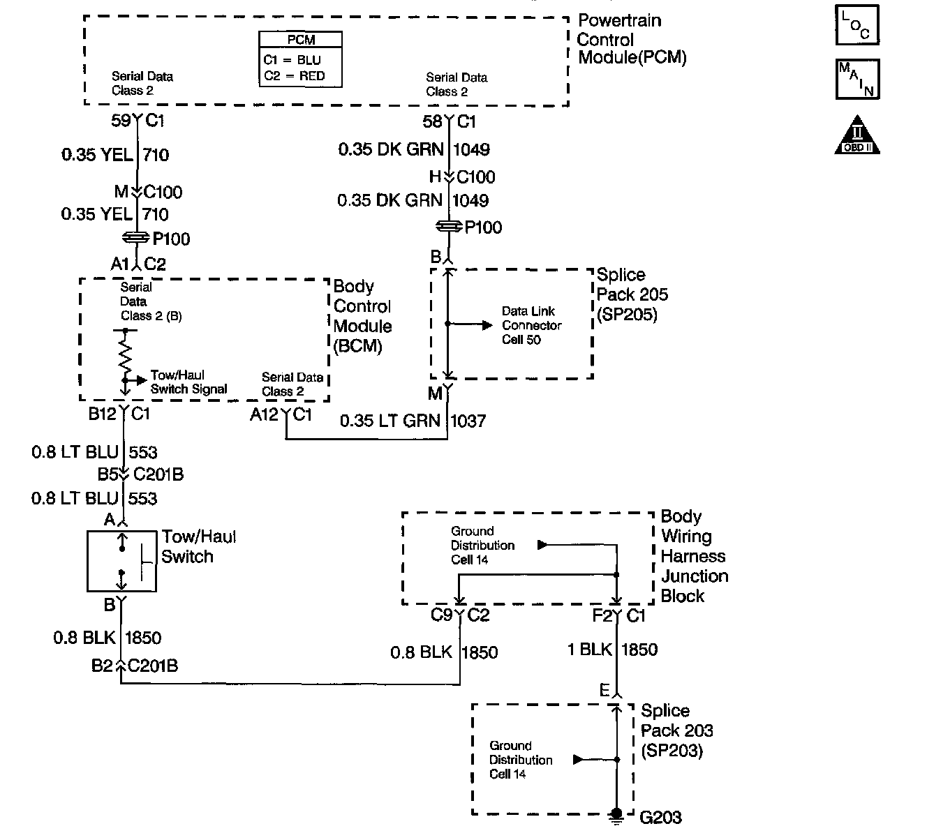Tow/Haul mode enables the operator to achieve enhanced shift performance when towing or hauling a load. When tow/haul is selected, the tow/haul switch input signal to the Body Control Module (BCM) is momentarily toggled to zero volts. The BCM sends a serial data message to the Powertrain Control Module (PCM) and Instrument Panel Controller (IPC). The PCM extends the length of time between upshifts, increases transmission line pressure and the IPC illuminates the tow/haul indicator lamp. Cycling the tow/haul switch again disables the tow/haul mode and returns the transmission to a normal shift pattern.