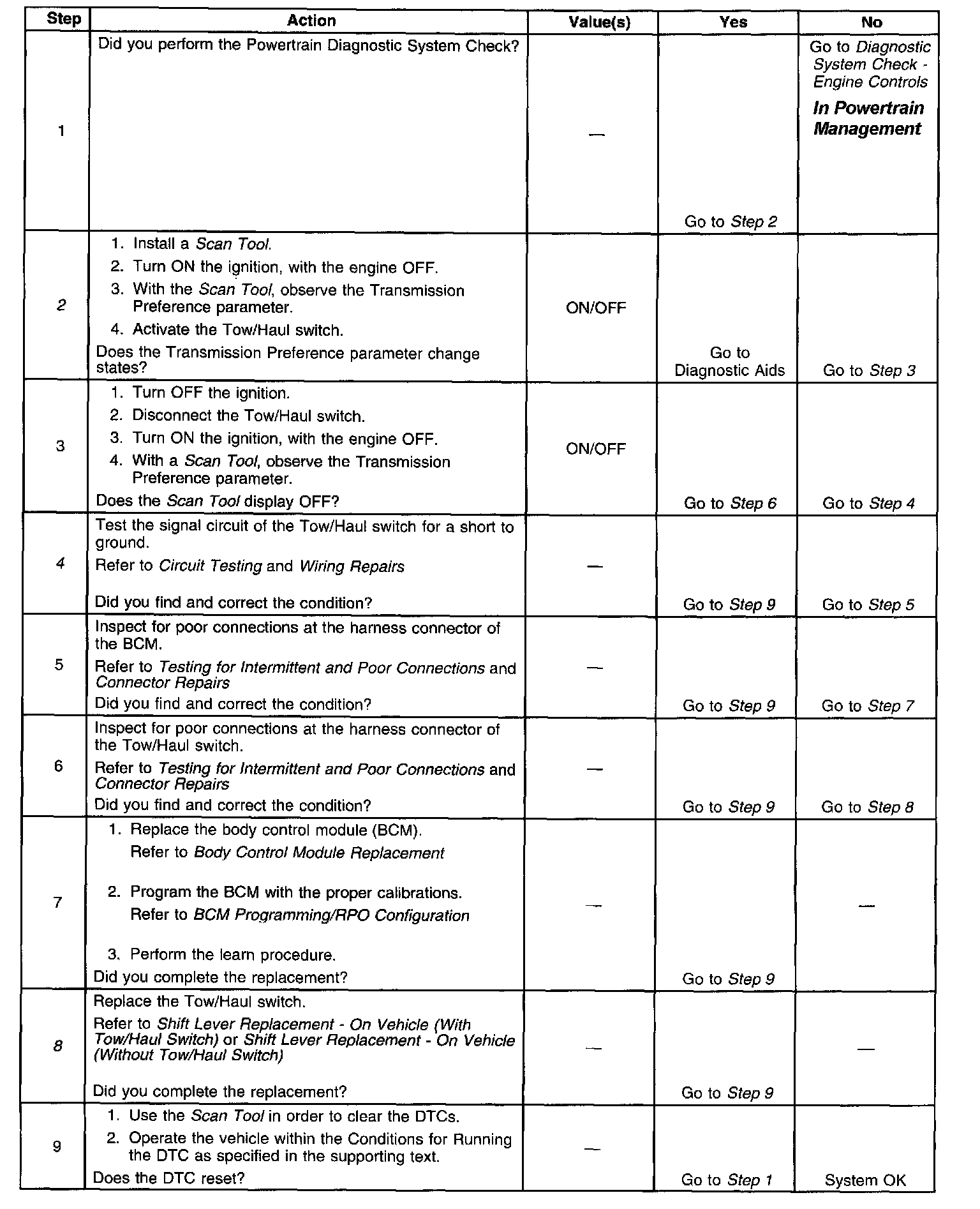 When the signal circuit of the Tow/Haul switch is shorted to ground for approximately 3 minutes. When the Tow/Haul switch is activated (stuck) for approximately 3 minutes.