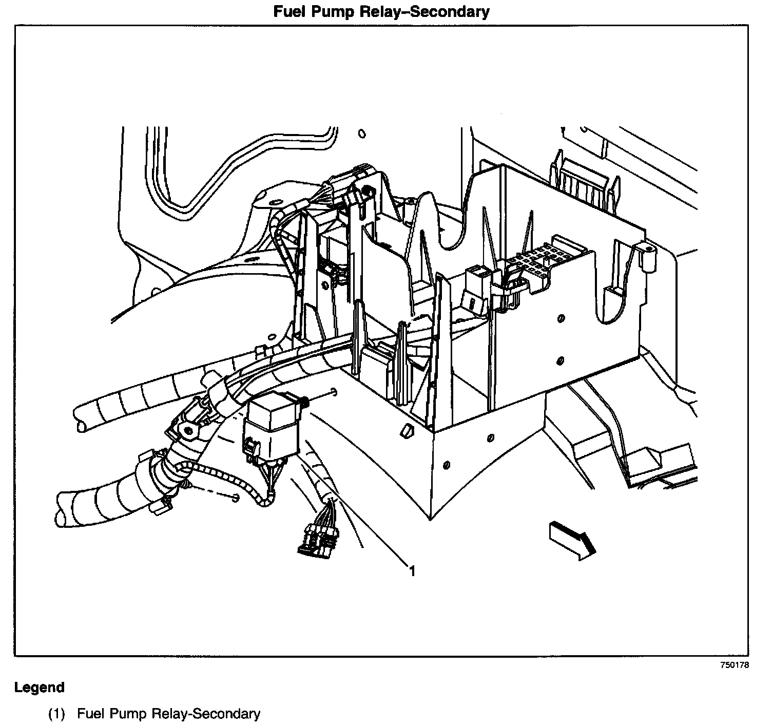 The Fuel Pump Relay - Secondary is attached to the Underhood Junction Block Bracket.