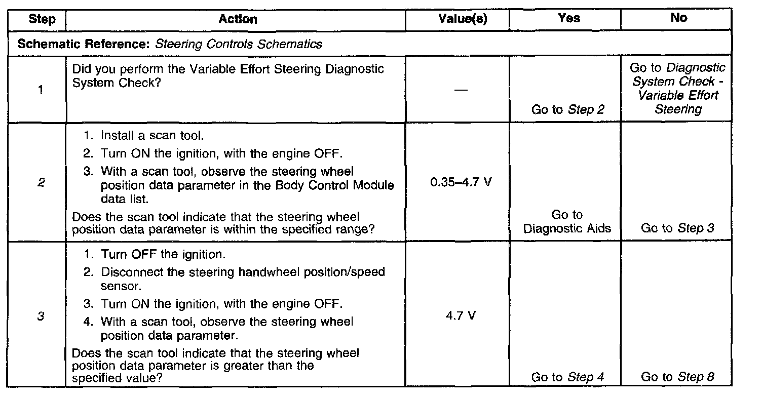 The steering wheel position/speed sensor is a O to 5 volt device which is used to measure steering wheel position. The valid output voltage range from the sensor is 0.35 to 4.75 volts. The output voltage will increase or decrease within the valid voltage range as the steering wheel is rotated.