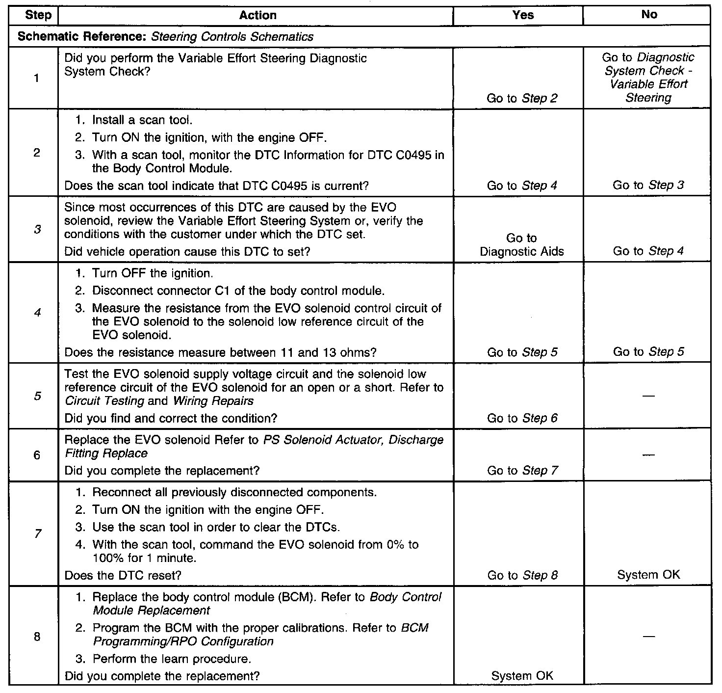 The body control module supplies a Pulse Width Modulated (PWM) voltage to the Electronic Variable Orifice (EVO) solenoid as well as a low reference path. The PWM voltage is used to control the current into the solenoid which controls the size of the output orifice of the power steering pump. This results in an increase or decrease in steering wheel turning effort. The body control module is constantly adjusting the PWM voltage and monitoring the current flow to achieve the desired PWM.