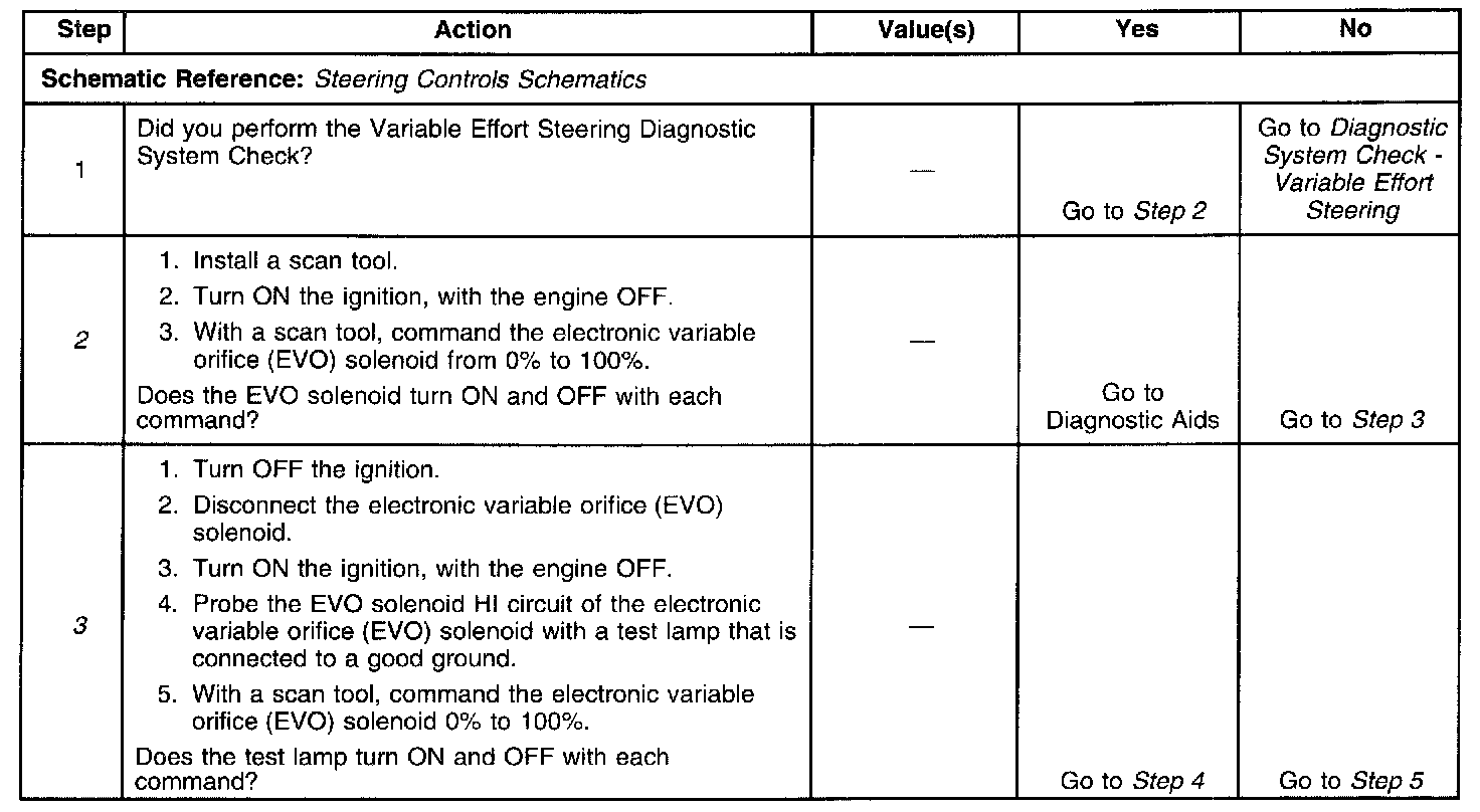 The body control module supplies a Pulse Width Modulated (PWM) voltage to the Electronic Variable Orifice (EVO) solenoid as well as a low reference path. The PWM voltage is used to control the current into the solenoid which controls the size of the orifice of the pressure output of the power steering pump. This results in a increase or decrease in steering wheel turning effort. The body control module is constantly adjusting the PWM voltage and monitoring the current to achieve the desired PWM. The system uses inputs from VSS and the steering handwheel position/speed sensor for the desired PWM output. This provides the vehicle speed related steering assist.