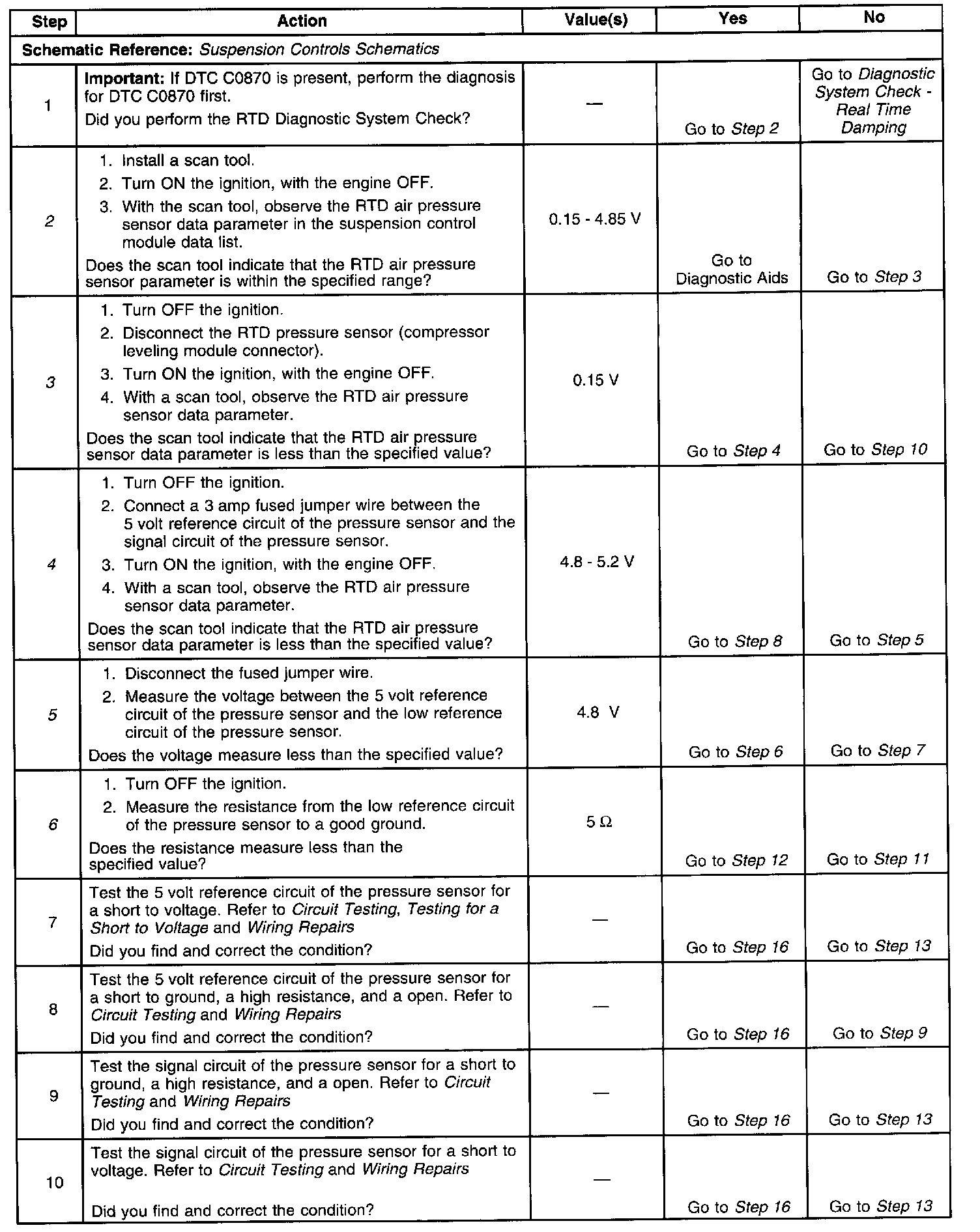 The suspension control module supplies 5 volts to the RTD air pressure sensor. The pressure sensor uses this reference voltage to produce an analog output of approximately 0.15 - 4.85 volts. The signal voltage is a reference of the air pressure in the rear leveling system.