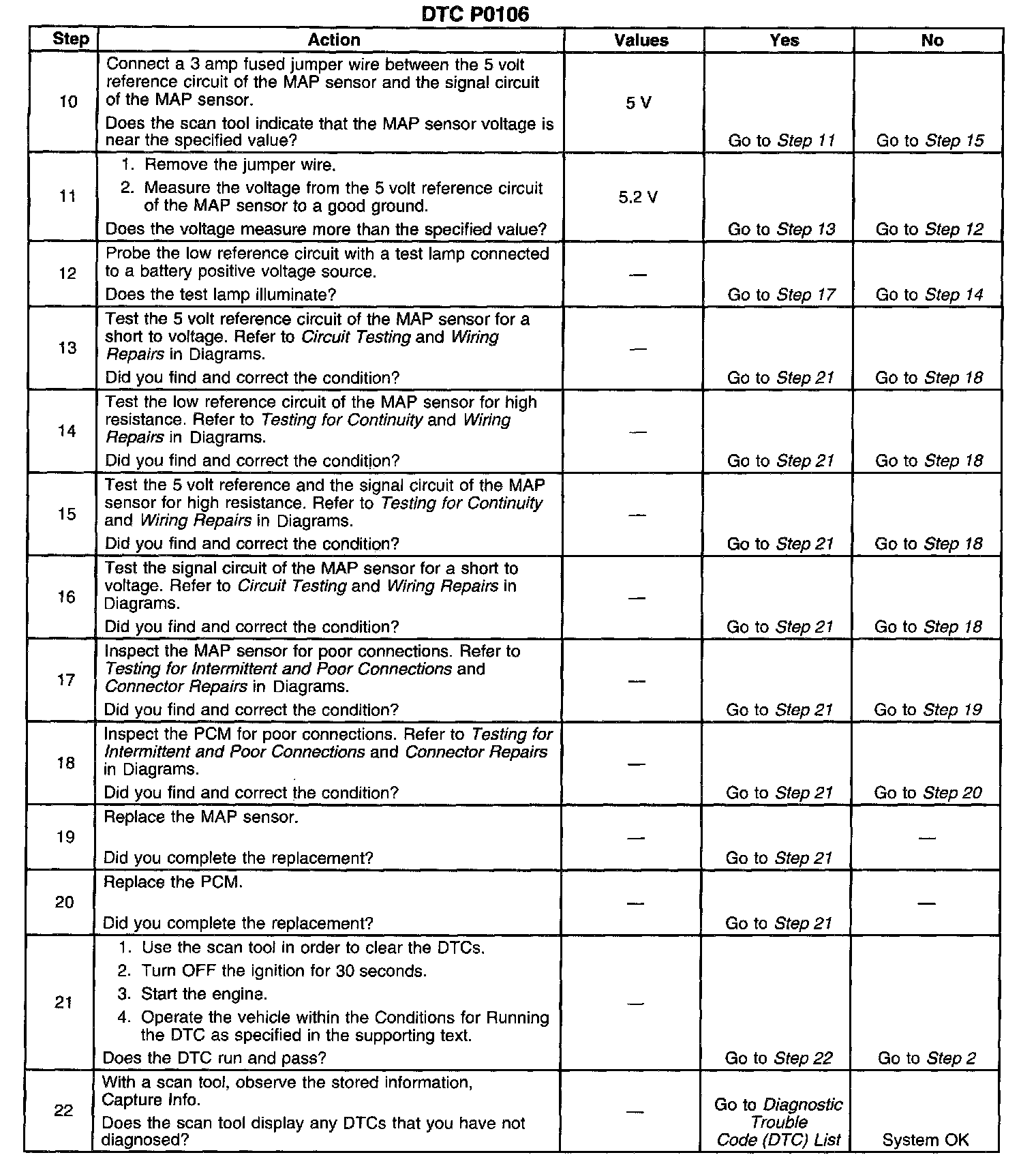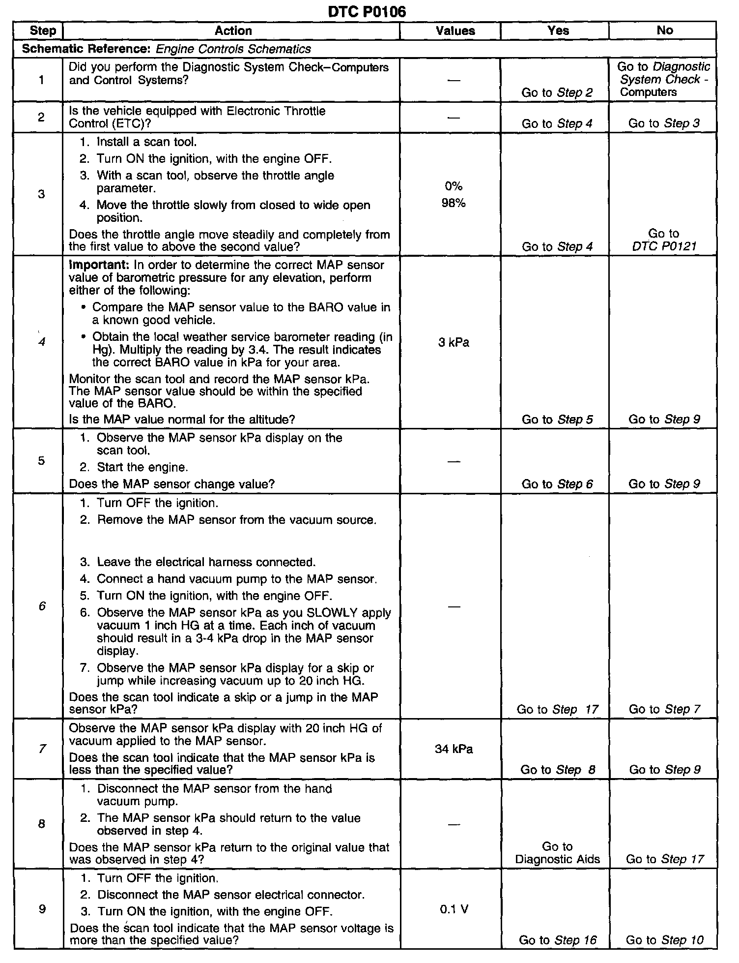 The PCM calculates a predicted value for the MAP sensor based on throttle position and engine speed. The PCM then compares the predicted value to the actual MAP sensor signal. DTC P0106 will set if the MAP sensor signal is not within the predicted range.