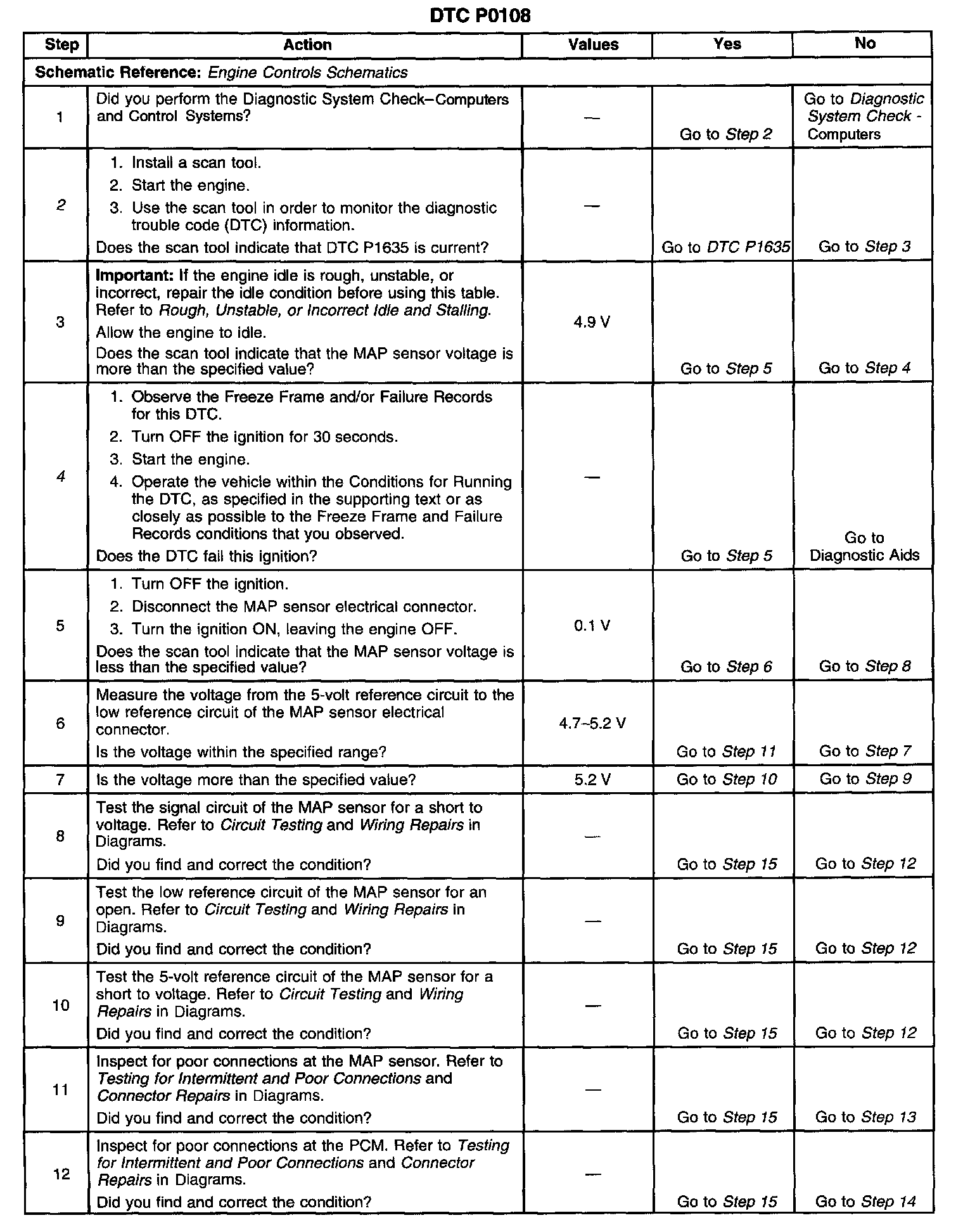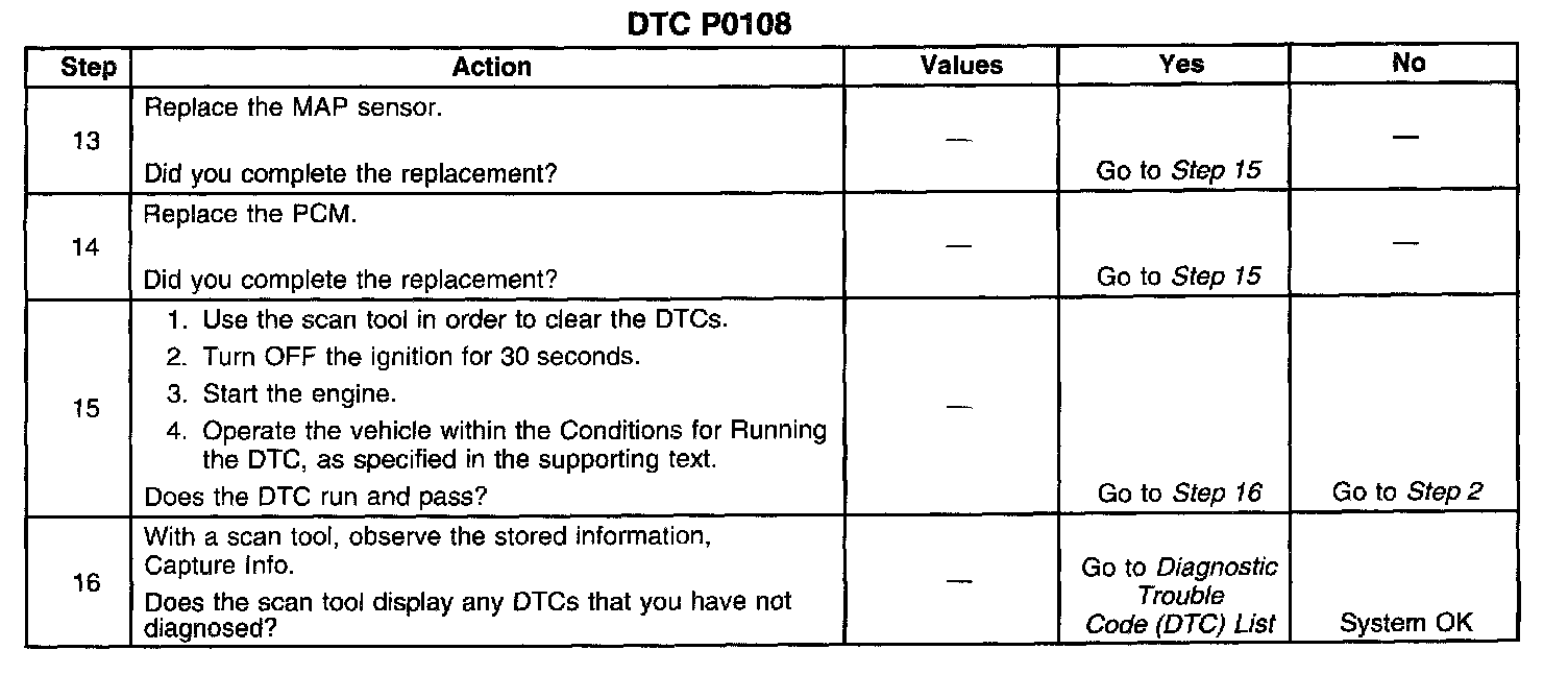 If the PCM detects a MAP sensor signal voltage that is excessively high, DTC P0108 will set.