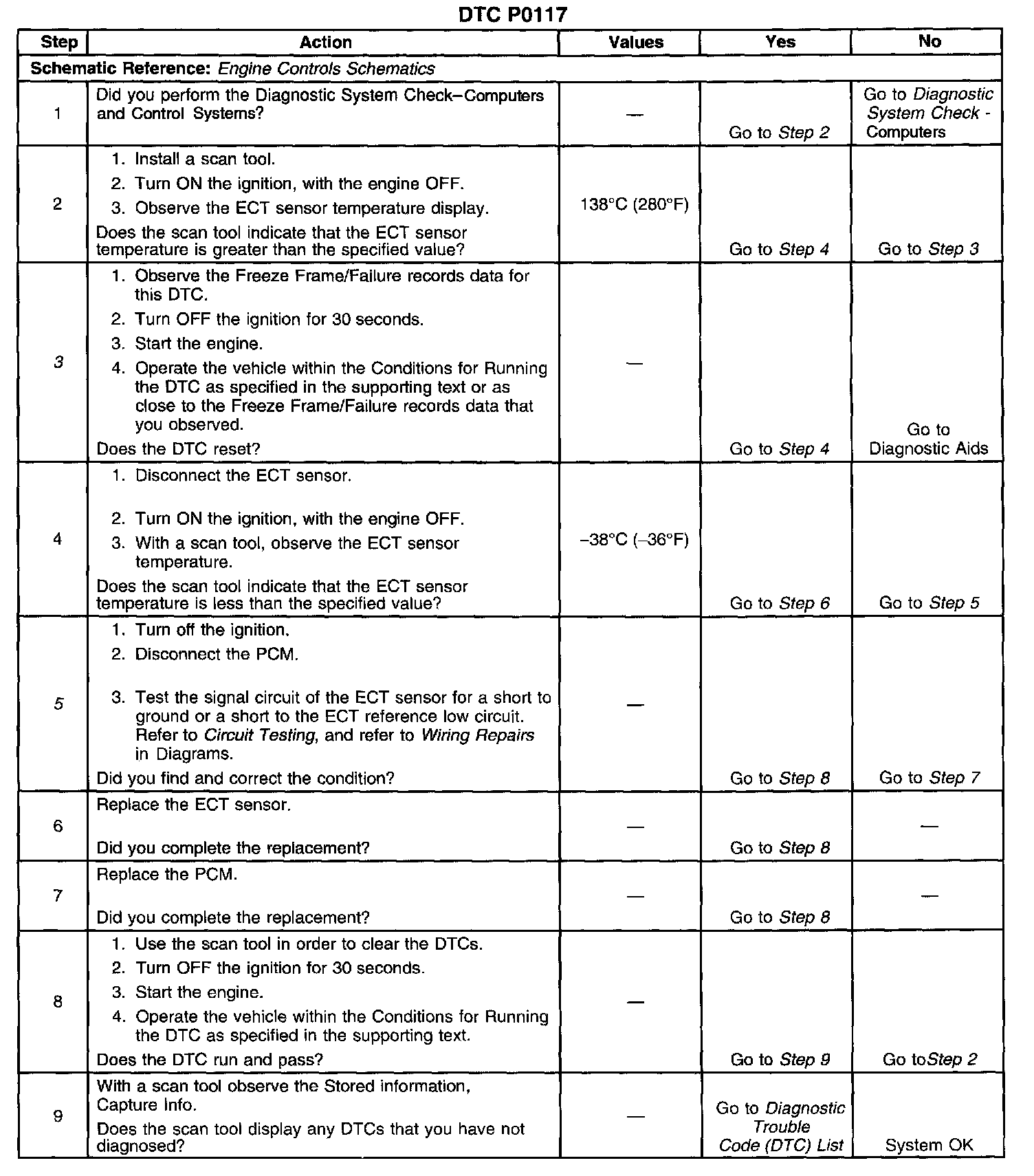 3. If DTC P0117 can only be repeated by duplicating the Failure Records, refer to Temperature vs Resistance. The table may be used to test the ECT sensor at various temperatures in order to evaluate the possibility of a shifted sensor that may be shorted above or below a certain temperature. If this is the case, replace the ECT sensor. If the ECT sensor appears to be OK, the malfunction is intermittent: refer to Diagnostic Aids.
