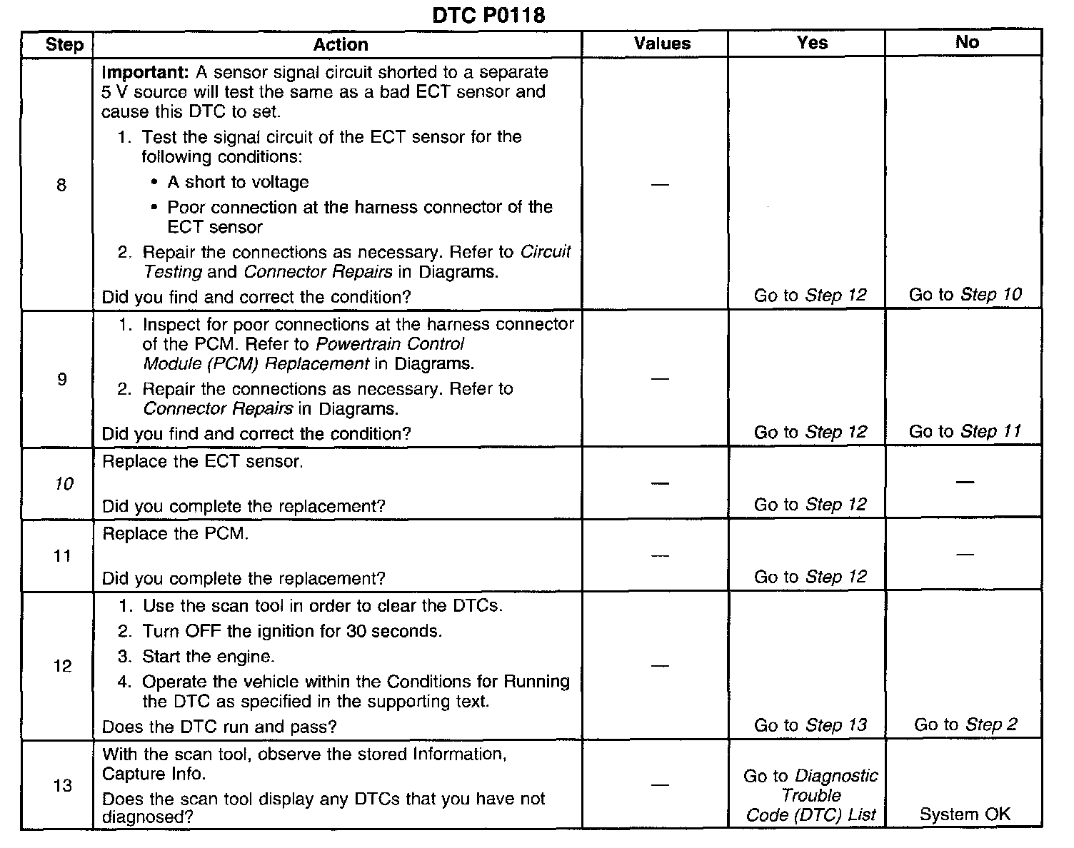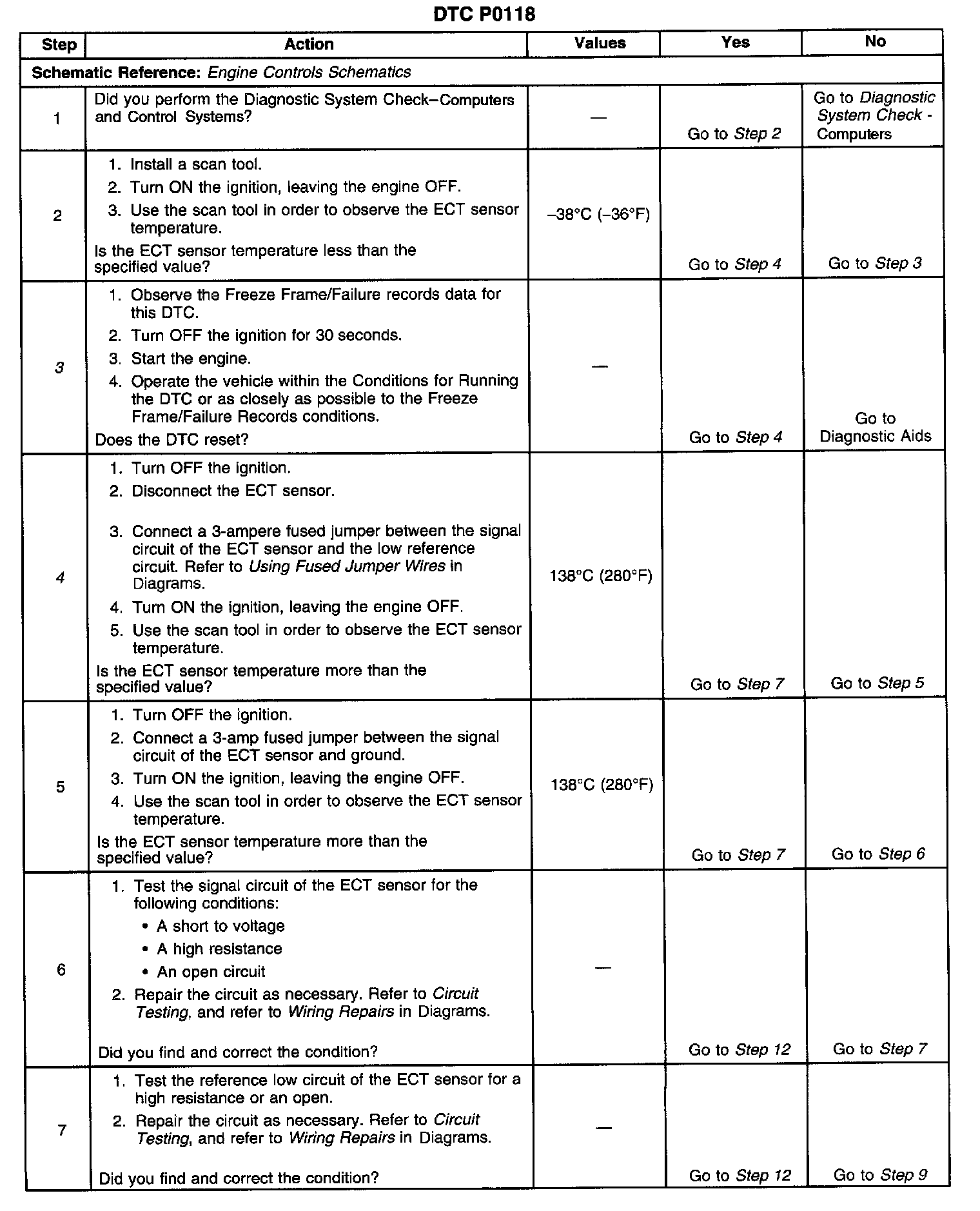 3. If DTC P0118 can only be repeated by duplicating the Failure Records, refer to the Temperature vs Resistance table. The table may be used to test the ECT sensor at various temperatures to evaluate the possibility of a shifted sensor that may be shorted above or below a certain temperature. If this is the case, replace the ECT sensor. If the ECT sensor appears to be OK, the malfunction is intermittent.