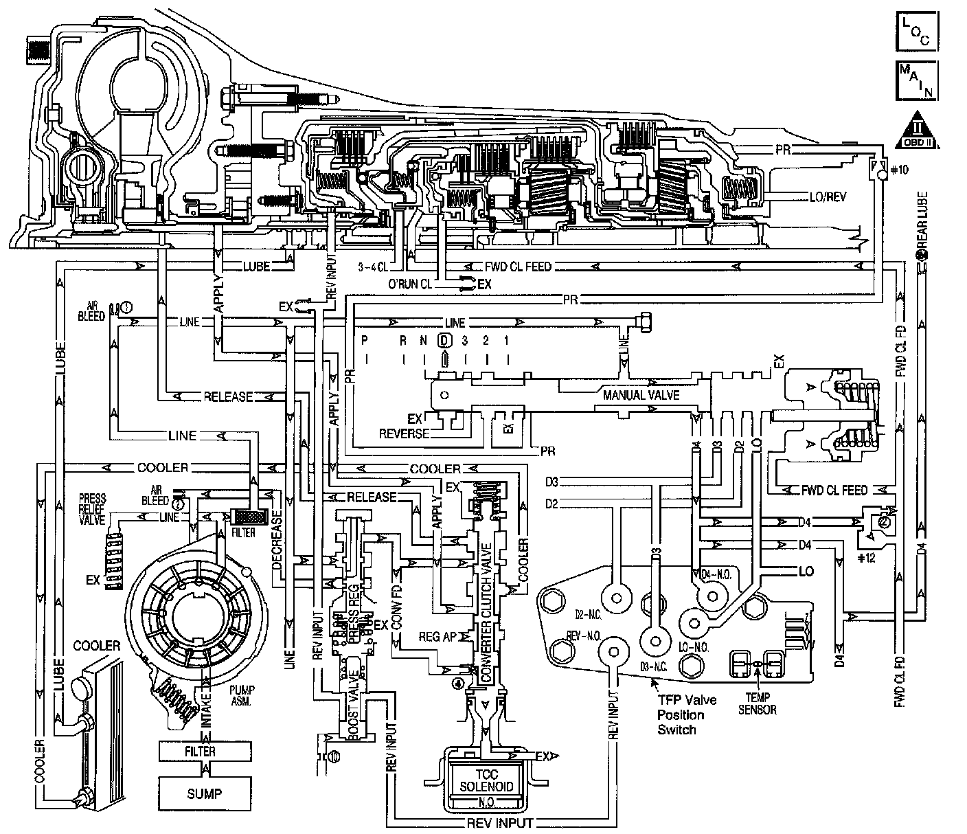 The flow of transmission fluid starts in the bottom pan and is drawn through the filter, control valve body assembly, transmission case and into the oil pump assembly. The oil pump assembly pressurizes the fluid and directs it to the pressure regulator valve where it becomes the main supply of fluid to the various components and hydraulic circuits in the transmission. Hot fluid exiting the torque converter flows through the converter clutch apply valve and into the transmission cooler lines to the oil cooler located in the vehicle radiator (and auxiliary cooler if equipped). From the cooler, fluid returns to cool and lubricate the front of the transmission. In forward drive ranges, D4 fluid from the manual valve is routed through an orificed cup plug in the rear of the transmission case to feed the rear lube fluid circuit.
