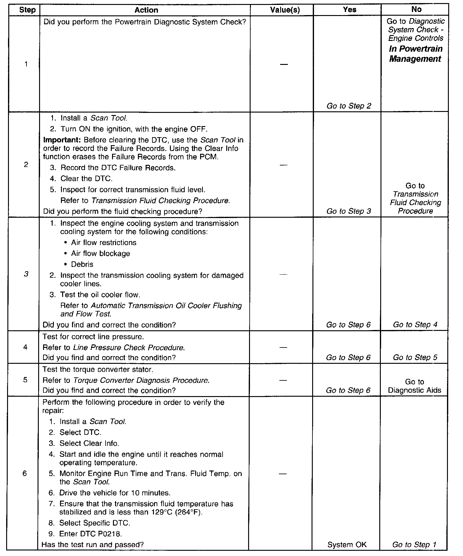 When the Powertrain Control Module (PCM) detects a high Transmission Fluid Temperature (TFT) for a long period of time, then DTC P0218 sets. DTC P0218 is a type C DTC.