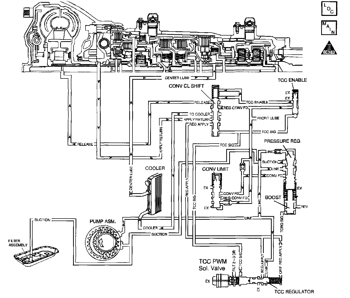 The flow of transmission fluid starts in the transmission pan. It is then drawn through the filter and transmission case into the oil pump assembly. The oil pump assembly pressurizes the fluid (line pressure), which becomes the main supply line of fluid. This fluid is directed to various components and hydraulic circuits within the transmission. The pressure regulator valve receives this fluid and directs it to the converter clutch shift valve. The converter clutch shift valve directs hot fluid leaving the torque converter or regulated converter feed fluid, through the cooler line to the transmission oil cooler. The transmission oil cooler is located in the radiator. The vehicle may also be equipped with an auxiliary oil cooler. The cooled fluid (center lube) is returned to the transmission through the return cooler line and into center lube port of the transmission. The automatic Transmission Fluid Temperature (TFT) sensor, senses the fluid temperature in the transmission pan.