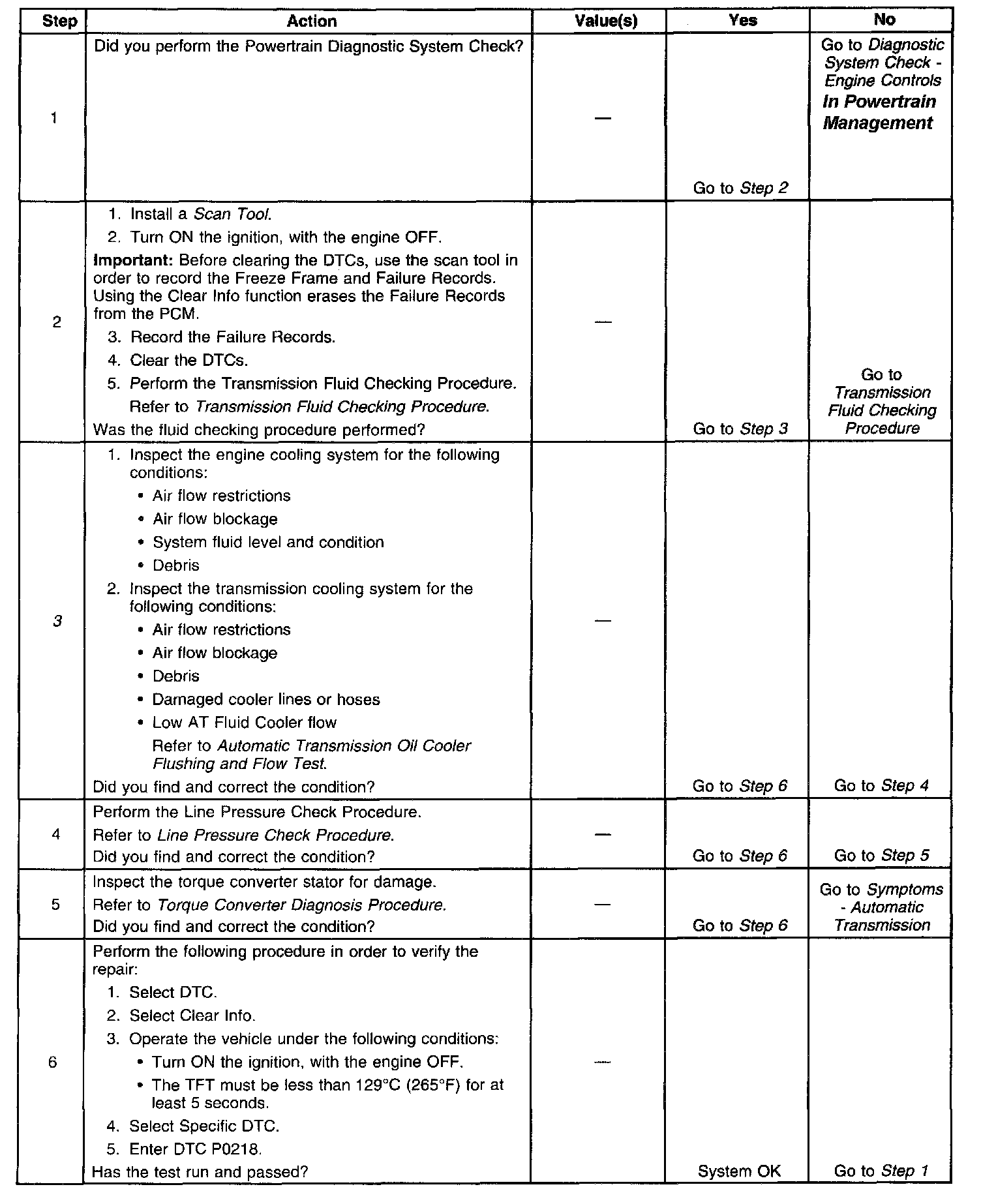 ^ DTC P0218 may set approximately 600 seconds (10 minutes) after DTC P0711 has set. Follow the diagnostic table for DTC P0711 before proceeding to the diagnostic table for DTC P0218. Repairing the condition that set DTC P0711 will likely eliminate DTC P0218.