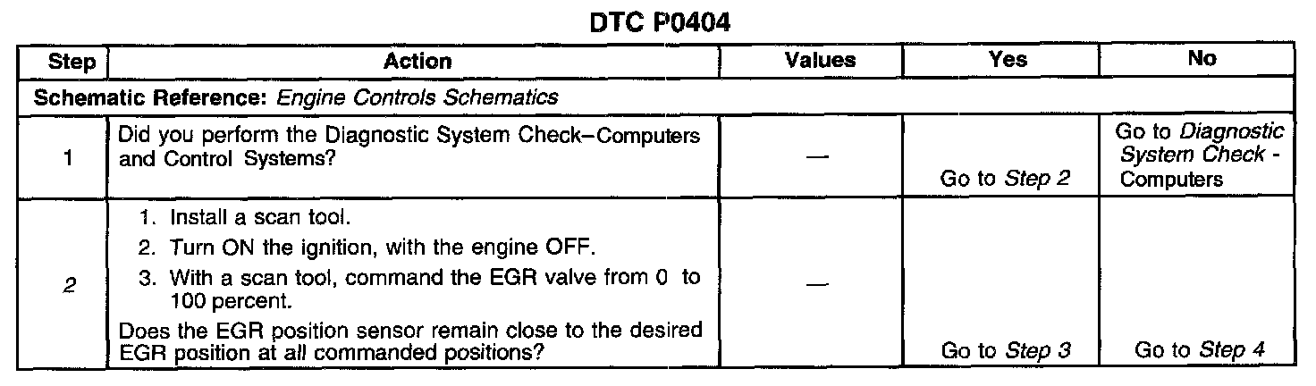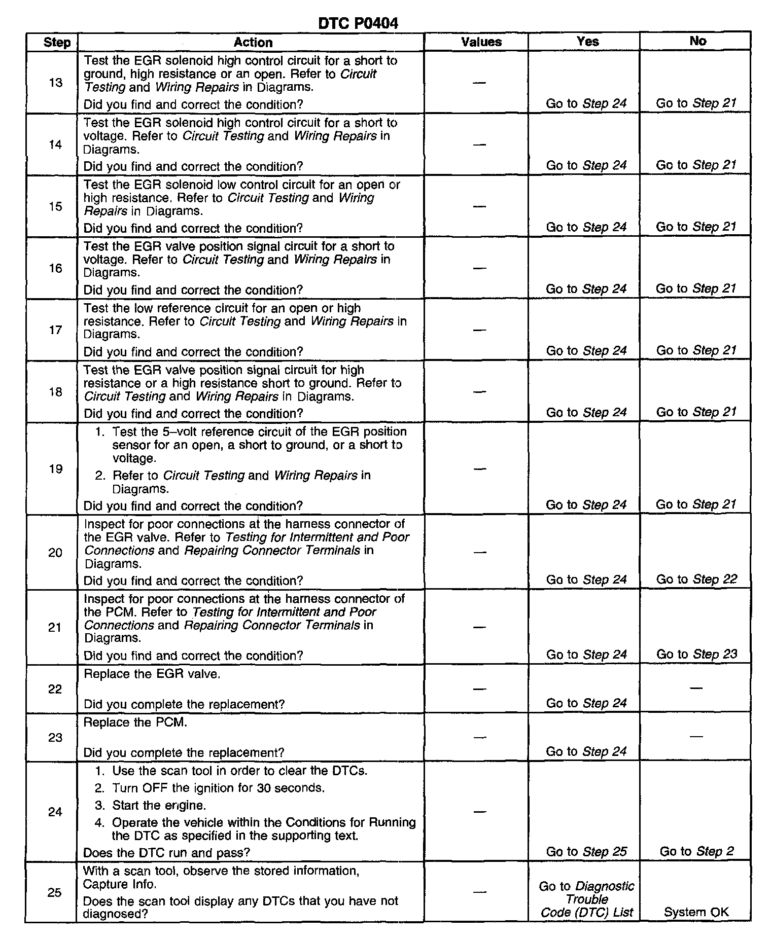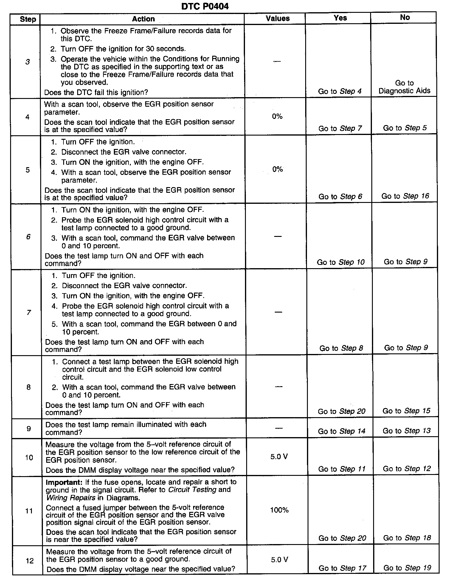 3. If DTC P0404 will only set under certain conditions, the malfunction may be intermittent. Refer to Diagnostic Aids. If an intermittent wiring problem is not present, test for a faulty connection at the PCM or the EGR valve. If the connections are OK and DTC P0404 continues to set, replace the EGR valve.