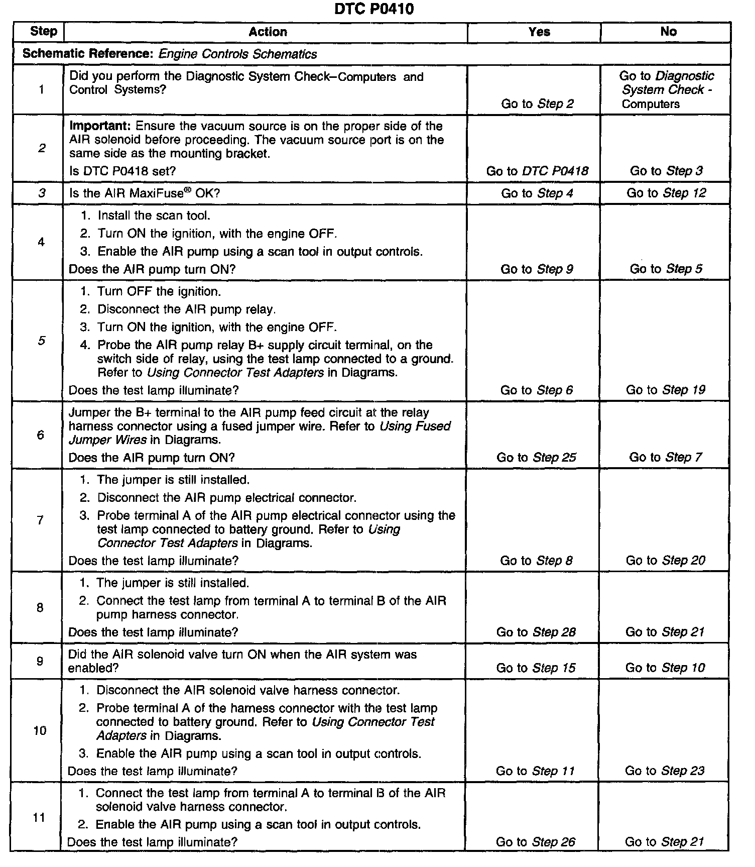 2. If DTC P0418 sets, this indicates the control side of the relay is not operating. Refer to DTC P0418 for further diagnosis. Vacuum lines that are reversed on the AIR solenoid causes this DTC to set. P0418